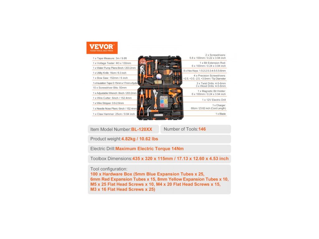 Rozměry pouzdra na nářadí: 435 x 320 x 115 mm / 17,13 x 12,60 x 4,53 palce,Číslo modelu položky: BL-120XX,Hmotnost výrobku: 4,82 kg / 10,62 lbs,Množství nářadí: 146,Maximální točivý moment elektrické vrtačky: 14 Nm