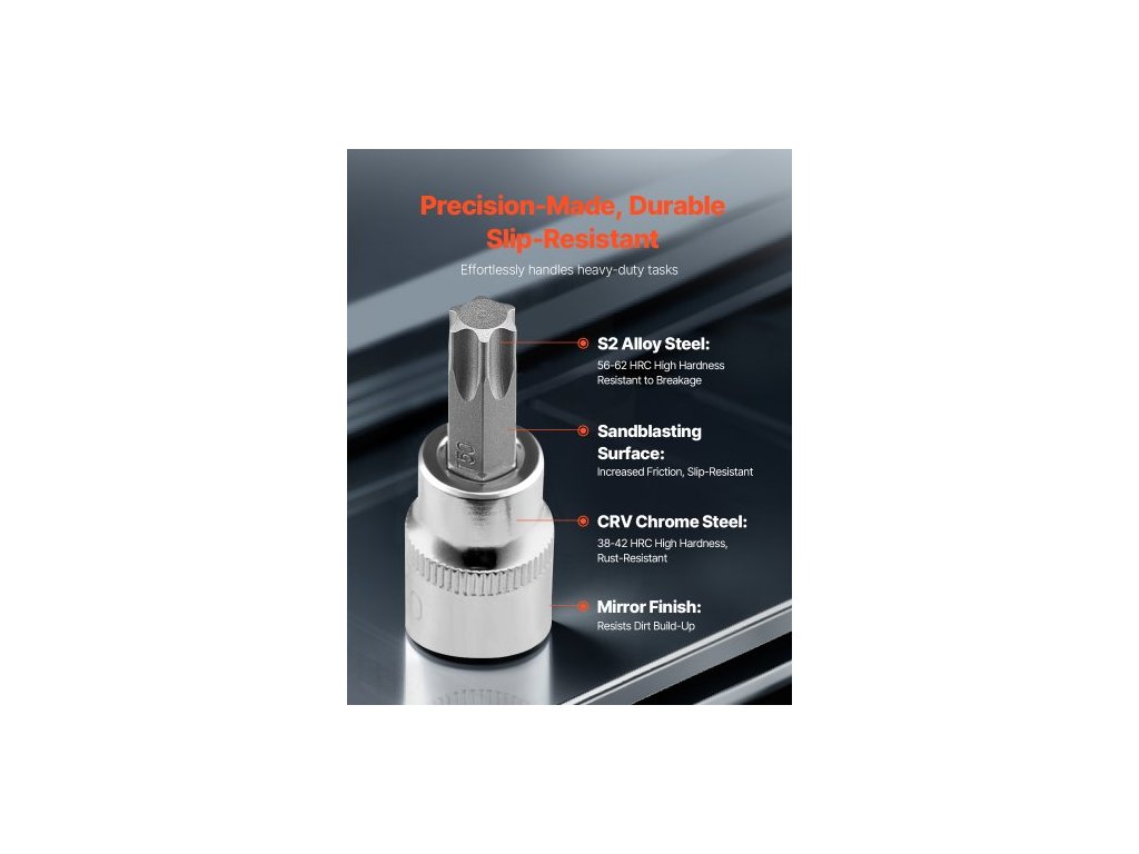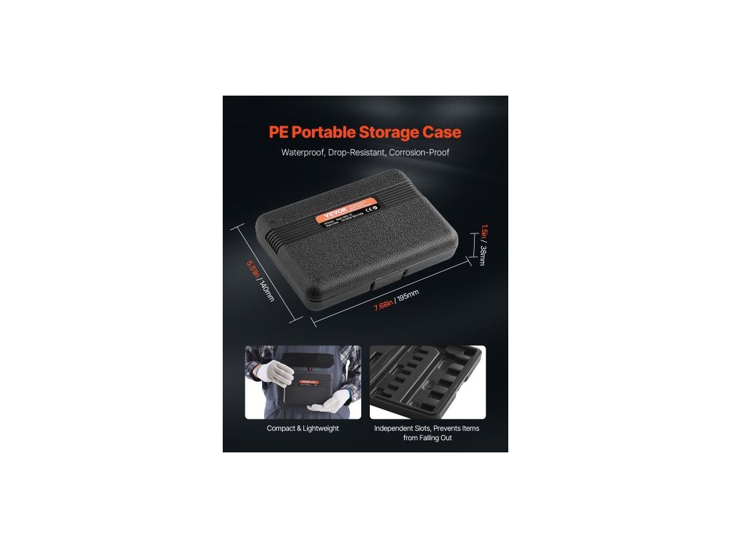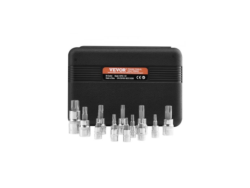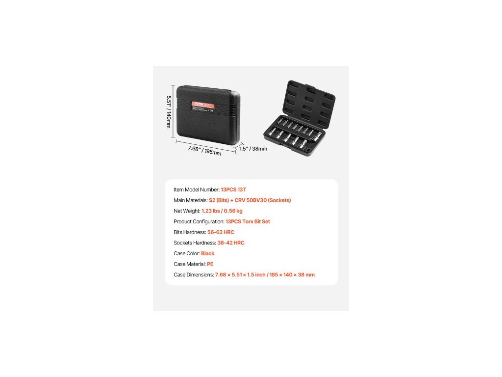 Barva pouzdra: Černá,Hlavní materiály: S2 (bity) + CRV 50BV30 (hlavní hlavice),Tvrdost bitů: 56-62 HRC,Tvrdost nástrčných hlavic: 38-42 HRC,Číslo modelu položky: 13 ks 13T,Konfigurace produktu: 13dílná sada bitů Torx,Materiál pouzdra: PE,Čistá hmotnost: 1,23 lbs / 0,56 Rozměry pouzdra (kg): 7,68 x 5,51 x 1,5 palce / 195 x 140 x 38 mm