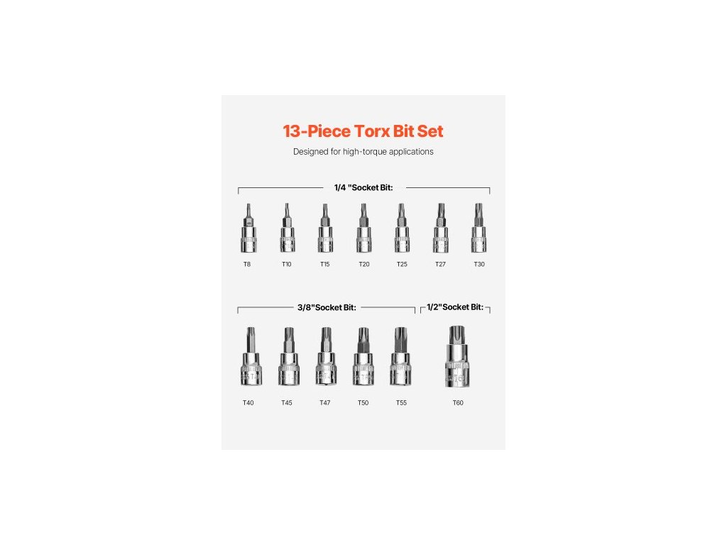 Sada nástrčných klíčů Torx, 13dílná sada hvězdicových T8 - T60, legovaná ocel S2 a chrom-vadenová ocel, pohony 1/4 palce, 3/8 palce a 1/2 palce, s vylepšeným úložným pouzdrem, nástrčné klíče Torx pro ruční použití, mechaniky, opravy automobilů