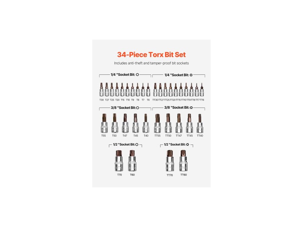 Sada nástrčných klíčů Torx, 34dílná, hvězdicovitá a odolná proti neoprávněné manipulaci, T6-T70, legovaná ocel S2 a chrom-vadenová ocel, pohony 1/4 palce, 3/8 palce a 1/2 palce, s vylepšeným úložným pouzdrem, nástrčné klíče Torx pro ruční použití