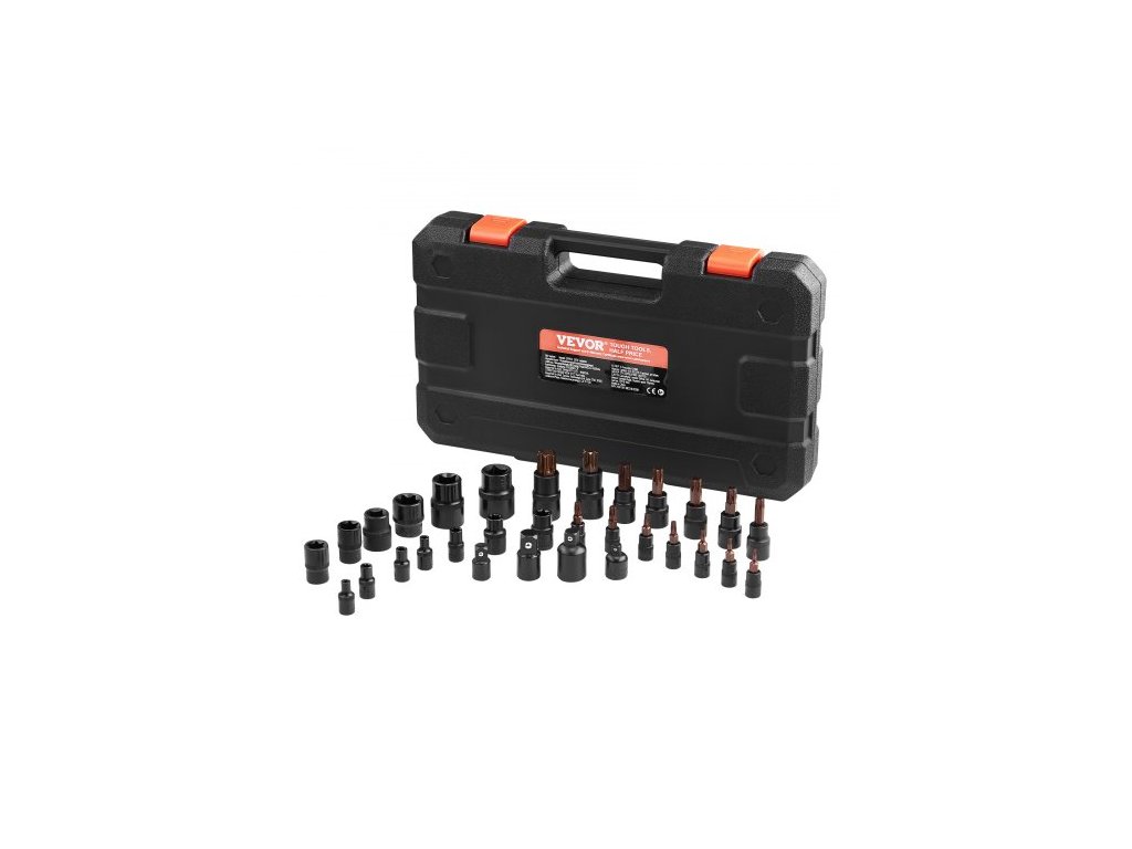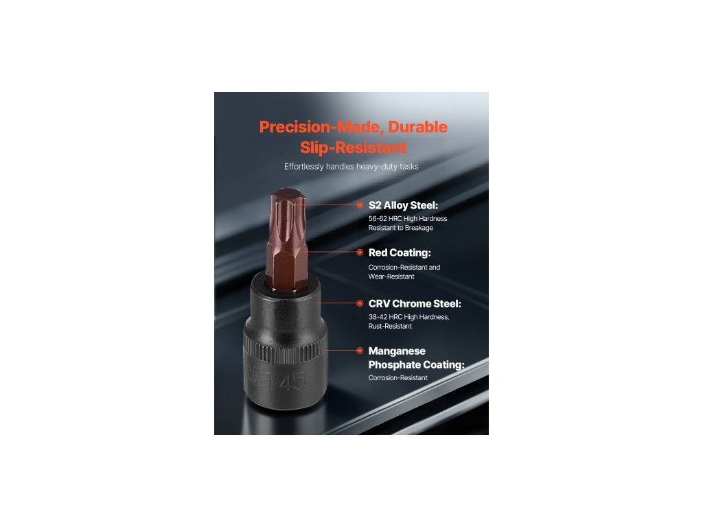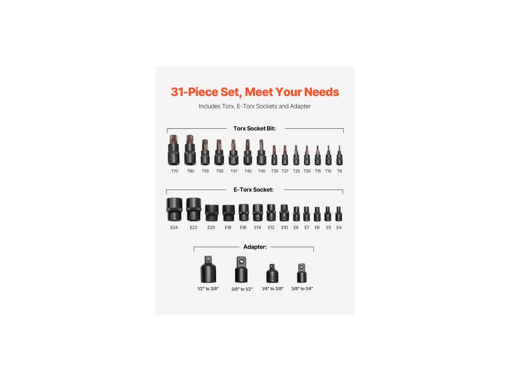 Sada nástrčných klíčů Torx a vnějších nástrčných klíčů Torx, 31dílná T8-T70 a E4-E24, legovaná ocel S2 a chrom-vadenová ocel, pohony 1/4 palce, 3/8 palce a 1/2 palce, s adaptérem a vylepšeným úložným pouzdrem, pro automobilový průmysl