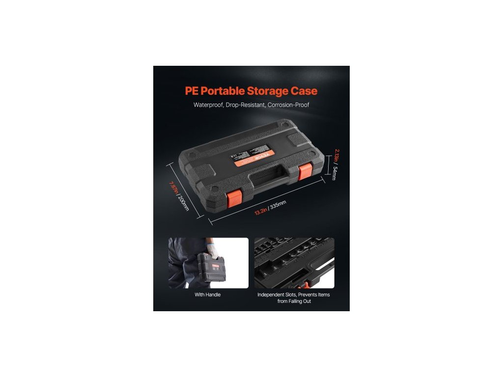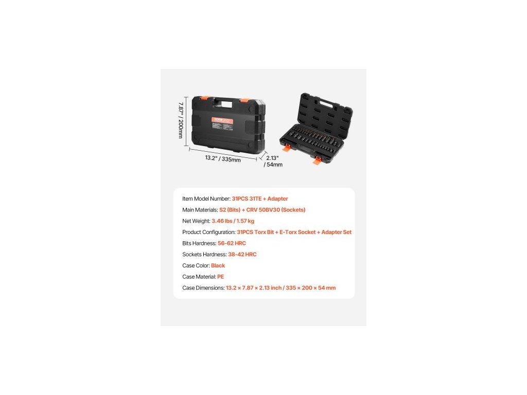Barva pouzdra: Černá,Hlavní materiály: S2 (bity) + CRV 50BV30 (hlavní hlavice),Tvrdost bitů: 56-62 HRC,Tvrdost nástrčných klíčů: 38-42 HRC,Číslo modelu položky: 31 ks 31TE + adaptér,Konfigurace produktu: 31dílná sada bitů Torx + nástrčných klíčů E-Torx + adaptéru,Materiál pouzdra: PE,Čistá hmotnost: 3,46 lb / 1,57 kg, Rozměry pouzdra: 13,2 x 7,87 x 2,13 palce / 335 x 200 x 54 mm