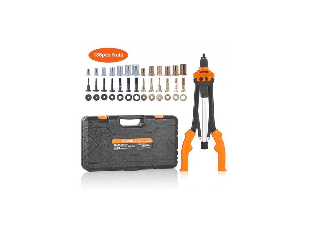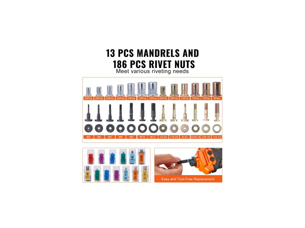 Sada nýtovacích matic , sada nýtovacích matic 40,6 cm s 13 díly metrických a SAE trnů, 186 dílů nýtovacích matic, M3, M4, 10-24, M5, M6, 1/4-20, 8-32, 5/16-18, M8, 3/8-16, M10, M12, 1/2-13, poloautomatické zatahování