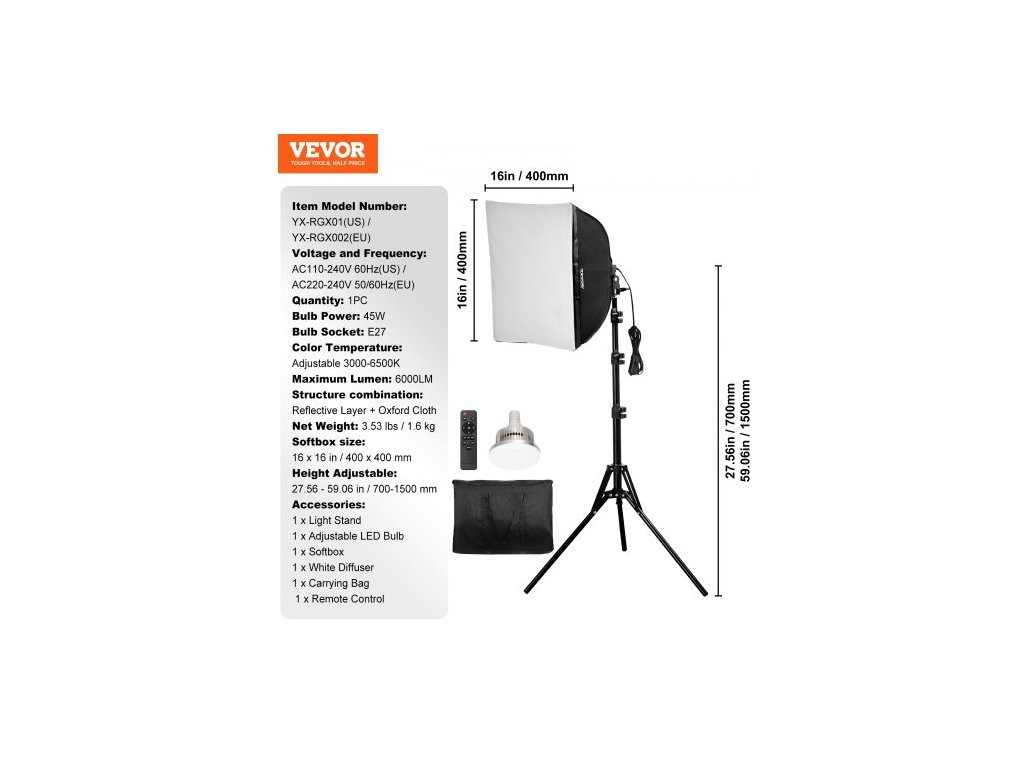 Výkon žárovky: 45 W,Kombinace konstrukce: Reflexní vrstva + Oxfordská tkanina,Napětí a frekvence: AC220-240 V 50/60 Hz (EU),Teplota chromatičnosti: Nastavitelná 3000-6500 K,Objímka žárovky: E27,Číslo modelu: YX-RGX002 (EU),Množství: 1 ks,Celkové rozměry: 16 x 16 x 6 palců / 400 × 400 x 150 mm,Maximální světelný tok: 6000 lm,Čistá hmotnost: 3,53 lbs / 1,6 kg,Velikost softboxu: 16 x 16 palců / 400 x 400 mm