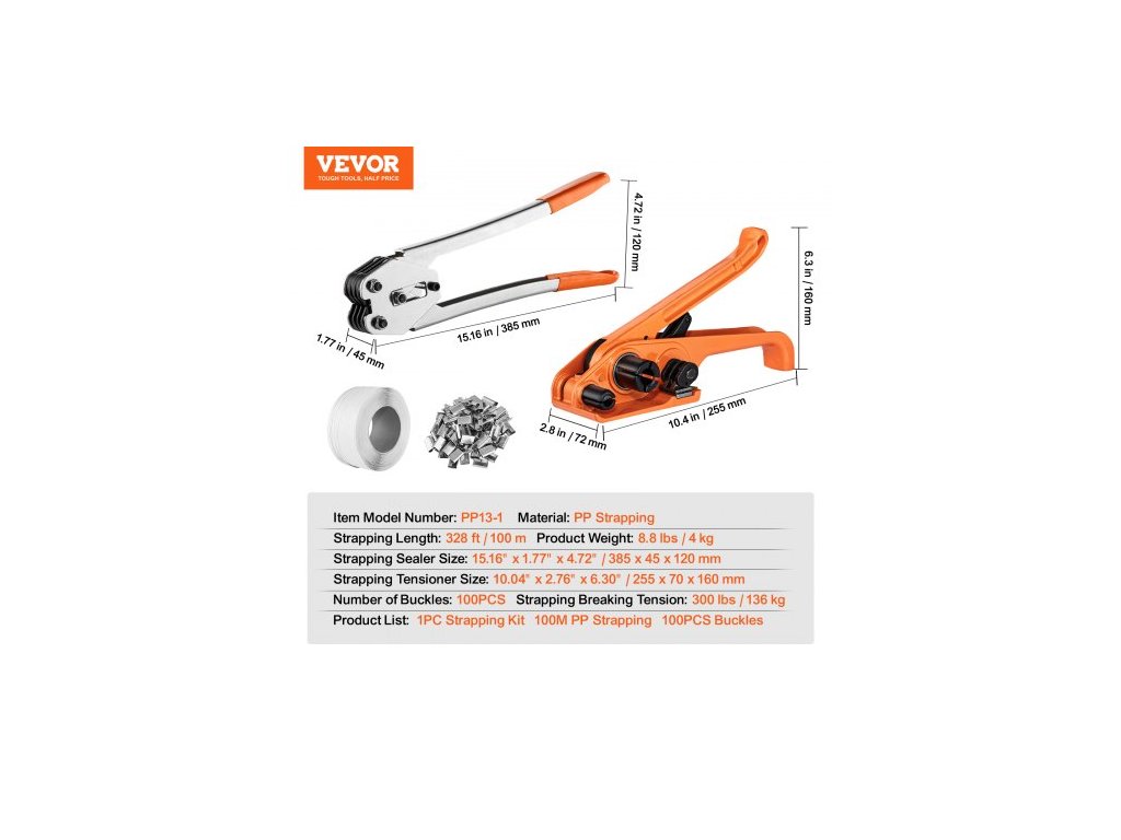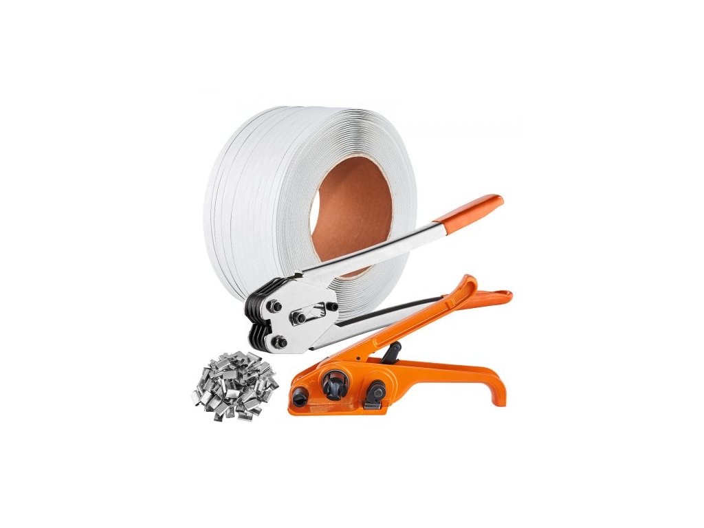 Počet přezek: 100 ks, Mezní napětí pásky: 136 kg, Rozměry napínače pásky: 255 x 70 x 160 mm, Délka pásky: 100 m, Číslo modelu položky: PP13-1, Rozměry svářečky pásky: 39 x 4,5 x 4,5 cm 4,72"/385 x 45 x 120 mm,Hmotnost výrobku: 8,8 lbs/4 kg,Materiál: PP páska