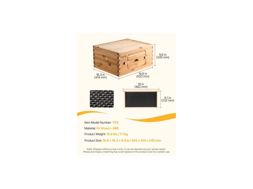 Kapacita: 10 rámků,Rozměry hlubokého úlu: 503x414x245 mm / 19,80x16,29x9,64 palce,Model: FX2,Hmotnost výrobku: 7,1 kg / 15,65 lbs,Rozměry hlubokého rámu: 482x232x35 mm / 18,97x9,13x1,37 palce