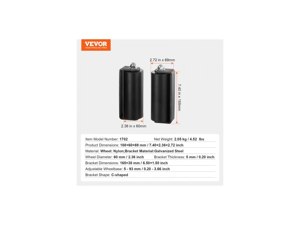 rozměry konzoly (DxŠ): 165x38 mm / 6,50x1,50 palce,materiály: kolečko - nylon; konzola - ocel Q235B,číslo modelu položky: 1702,tloušťka konzoly: 5 mm,průměr kolečka: 60 mm / 2,36 palce,tvar konzoly: tvar C,rozměry výrobku: 188x60x69 mm / 7,40x2,36x2,72 palce,čistá hmotnost: 2,05 kg / 4,52 lbs