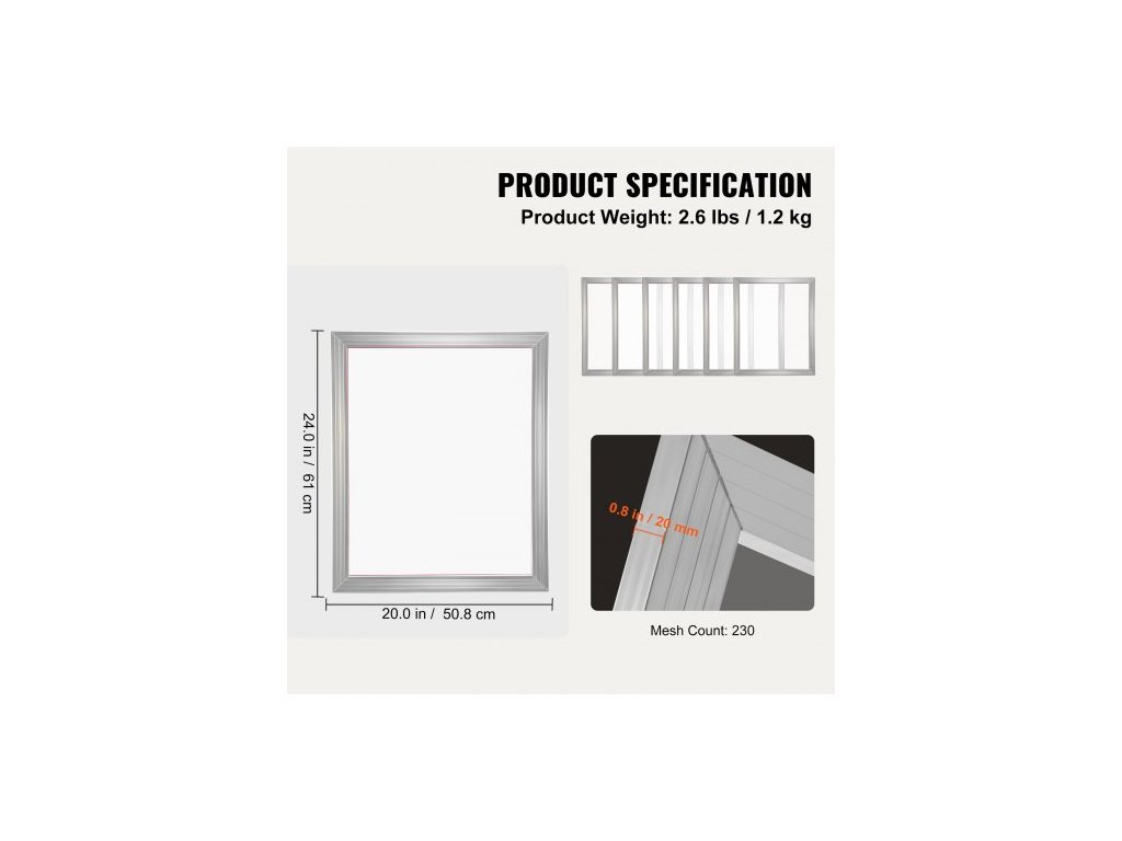 Počet sítotiskových rámů: Dva,Materiál síťoviny: Polyester,Tloušťka rámu: 2,5 cm,Počet ok: 230,Materiál rámu: Hliníková slitina,Čistá hmotnost: 1,2 kg,Rozměry rámu: 50,8 x 61 cm,Rozměry balení: 62 x 52 x 6 cm