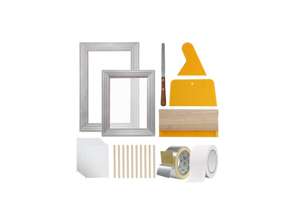 Sada pro sítotisk , 2 kusy hliníkových rámů pro sítotisk 8x10/10x14" 110 kusů mřížky, 2 pásky a stěrky pro sítotisk a průhledné fólie na trička, potisk vlastními silami