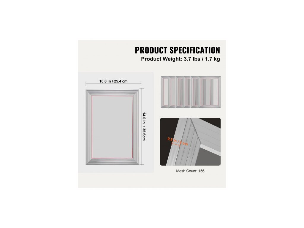 Rozměry: 10 x 14 palců / 25,4 x 35,6 cm,Počet sítotiskových rámů: 6,Materiál síťoviny: Polyester,Tloušťka rámu: 0,8 palce / 2 cm,Počet ok: 156,Materiál rámu: Hliníková slitina,Čistá hmotnost: 3,7 lbs / 1,7 kg,Rozměry balení: 14,5 x 10,6 x 5,3 palce / 37 x 27 x 13,5 cm