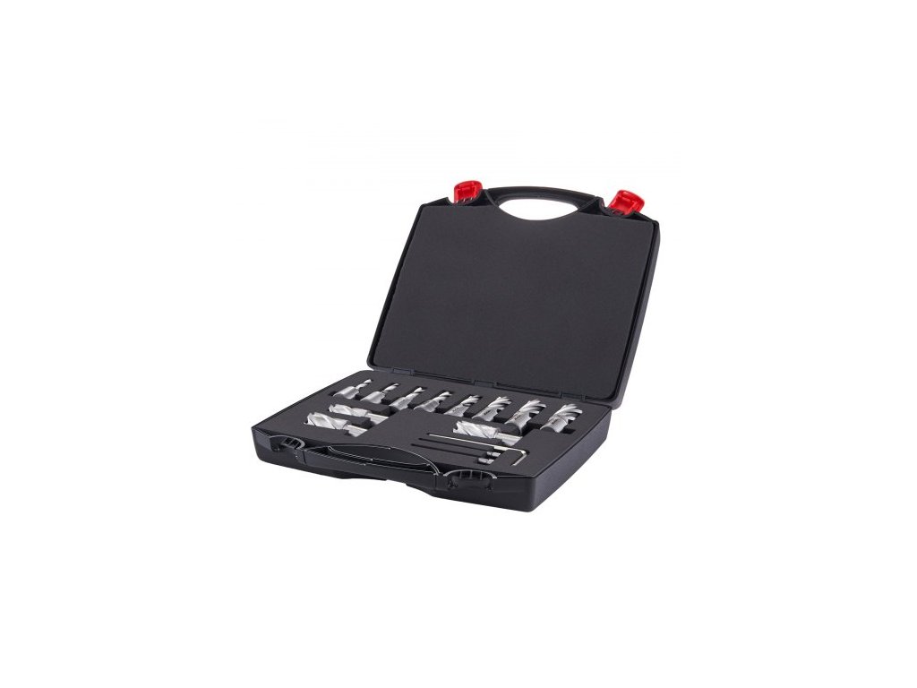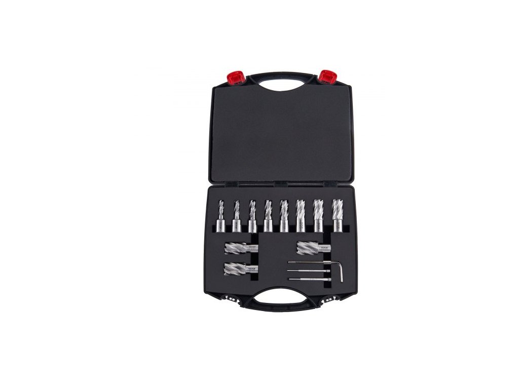Sada prstencových fréz , 13dílná sada vrtáků s upínací stopkou Weldon Mag, hloubka řezu 2,5 cm, průměr řezu 1,1 až 1-2,7 cm, M2AL HSS, 2 pilotní kolíky, šestihranný klíč a přenosné pouzdro, pro použití s magnetickými vrtačkami