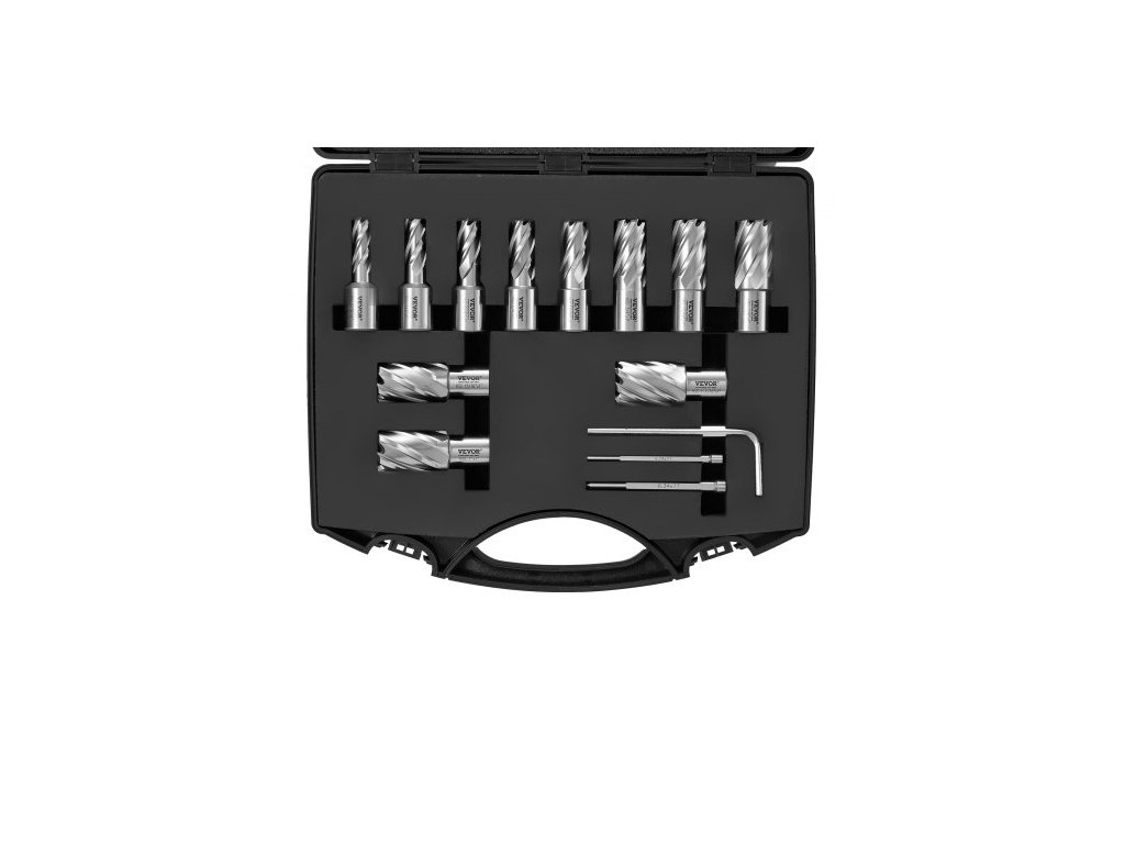 Sada prstencových fréz , 13dílná sada vrtáků s stopkou Weldon Mag, hloubka řezu 2,5 cm, průměr řezu 1,1 až 1–2,7 cm, M2AL HSS, 2 vodicí kolíky, šestihranný klíč a přenosné pouzdro, pro použití s magnetickými vrtačkami