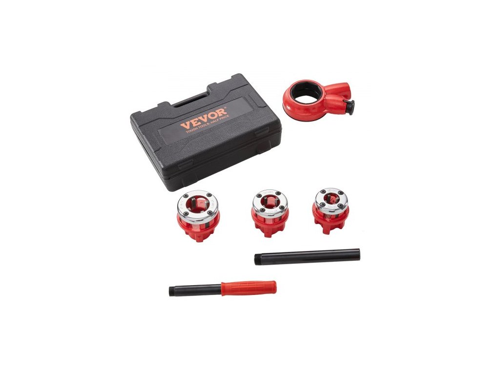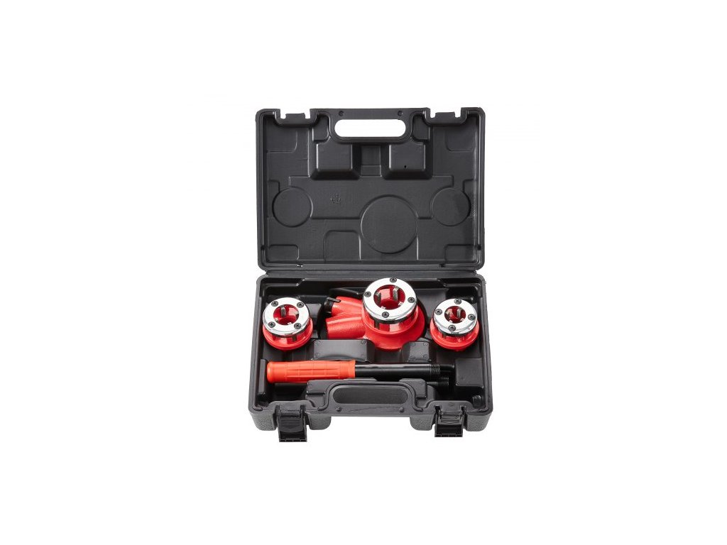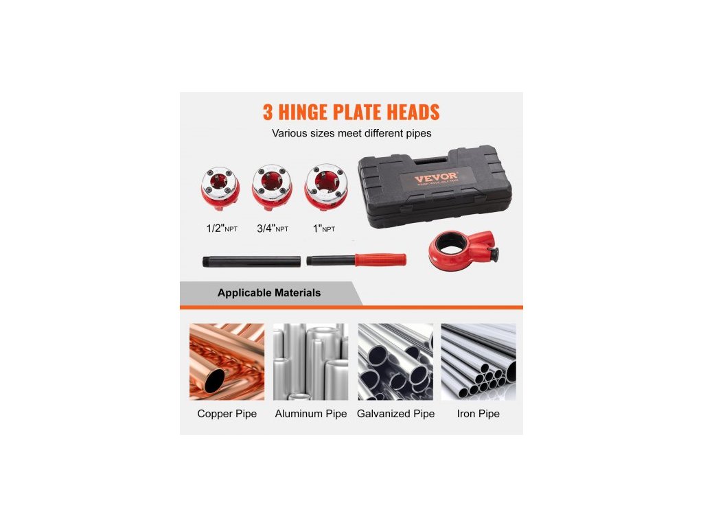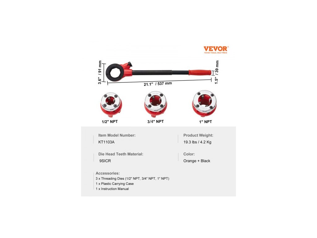 Materiál závitořezných zubů: 9SICR,Barva: Oranžová + Černá,Číslo modelu položky: KT1103A,Hmotnost výrobku: 9,3 lbs / 4,2 kg,3 závitořezné čelistí: 1/2" NPT, 3/4" NPT, 1" NPT,Rozměry výrobku: 21,1"x3,6"x1,5" / 537x91x39 mm