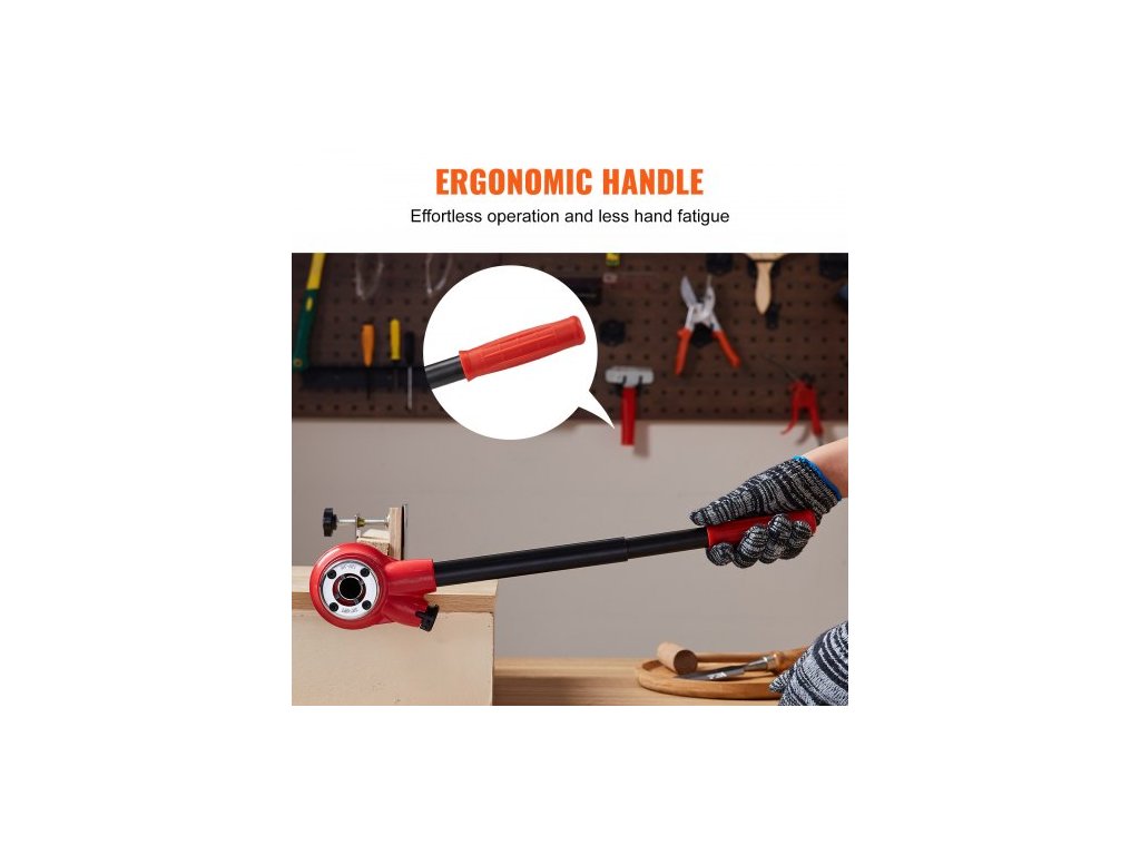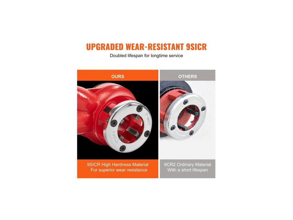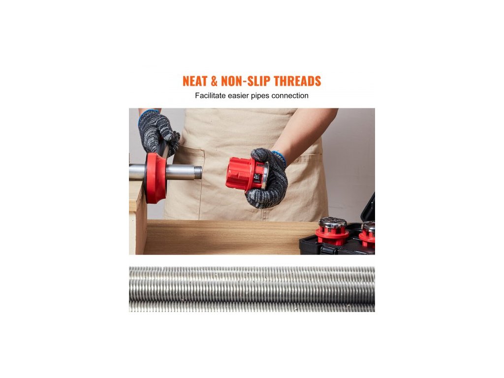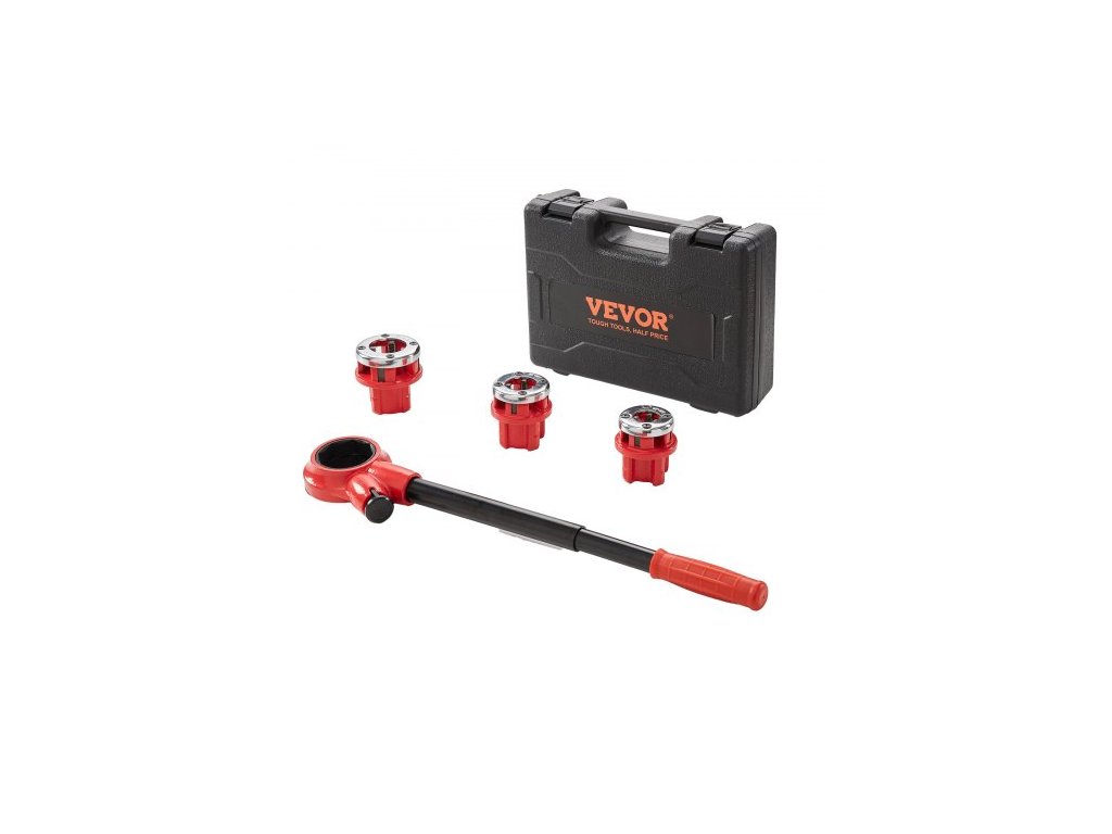 Materiál závitořezných zubů: 9SICR,Barva: Oranžová + Černá,Číslo modelu položky: KT1103A,Hmotnost výrobku: 9,3 lbs / 4,2 kg,3 závitořezné čelistí: 1/2" NPT, 3/4" NPT, 1" NPT,Rozměry výrobku: 21,1"x3,6"x1,5" / 537x91x39 mm