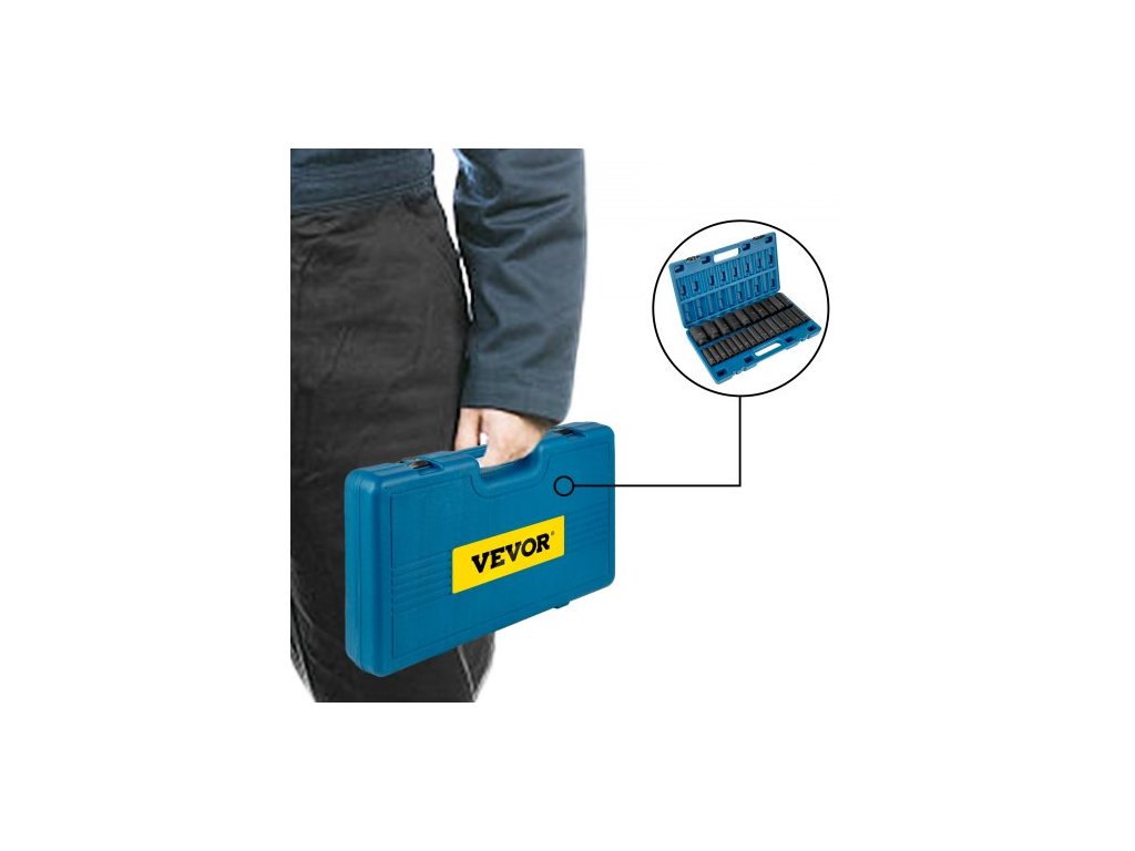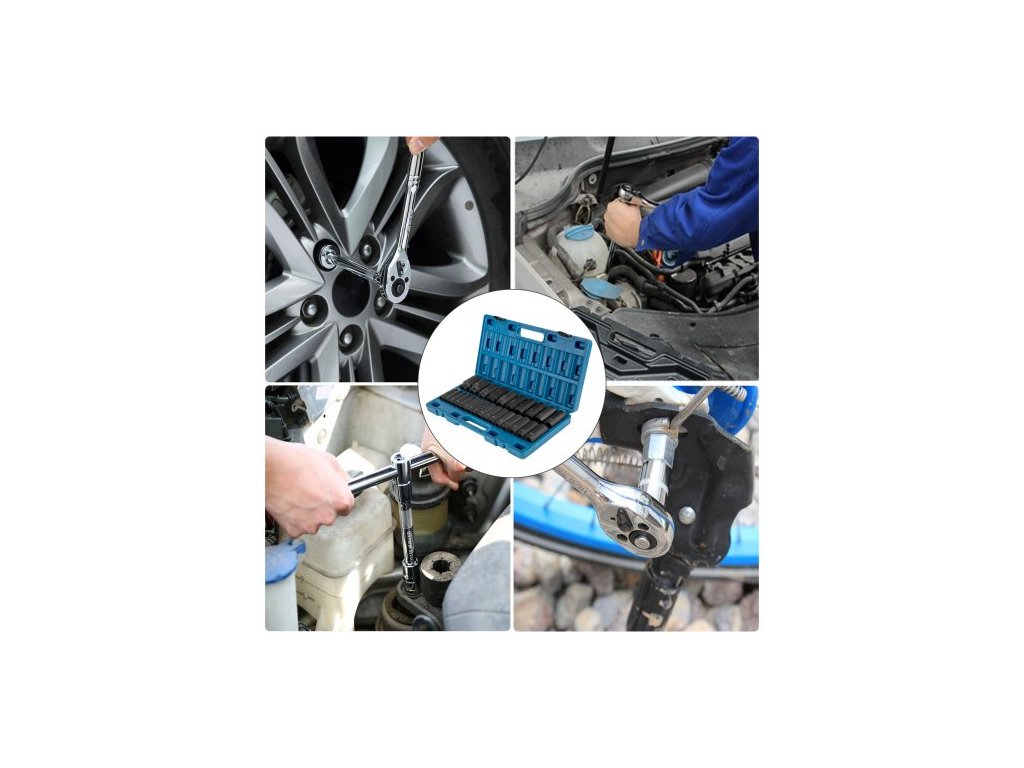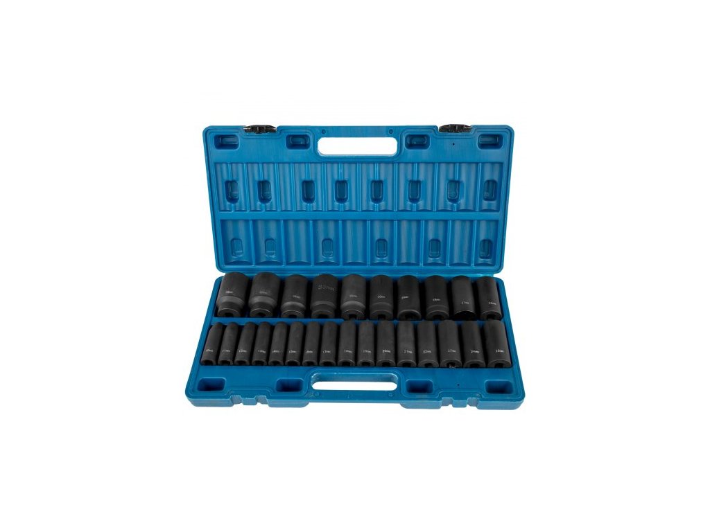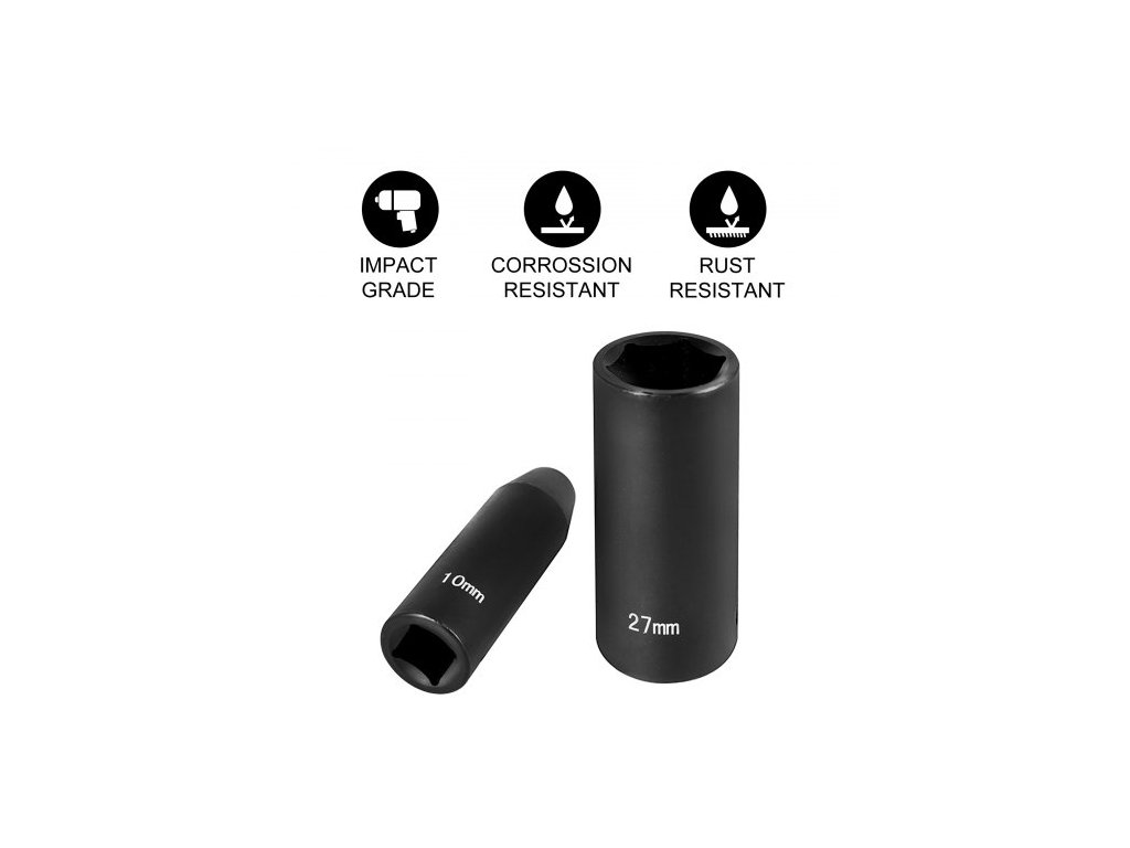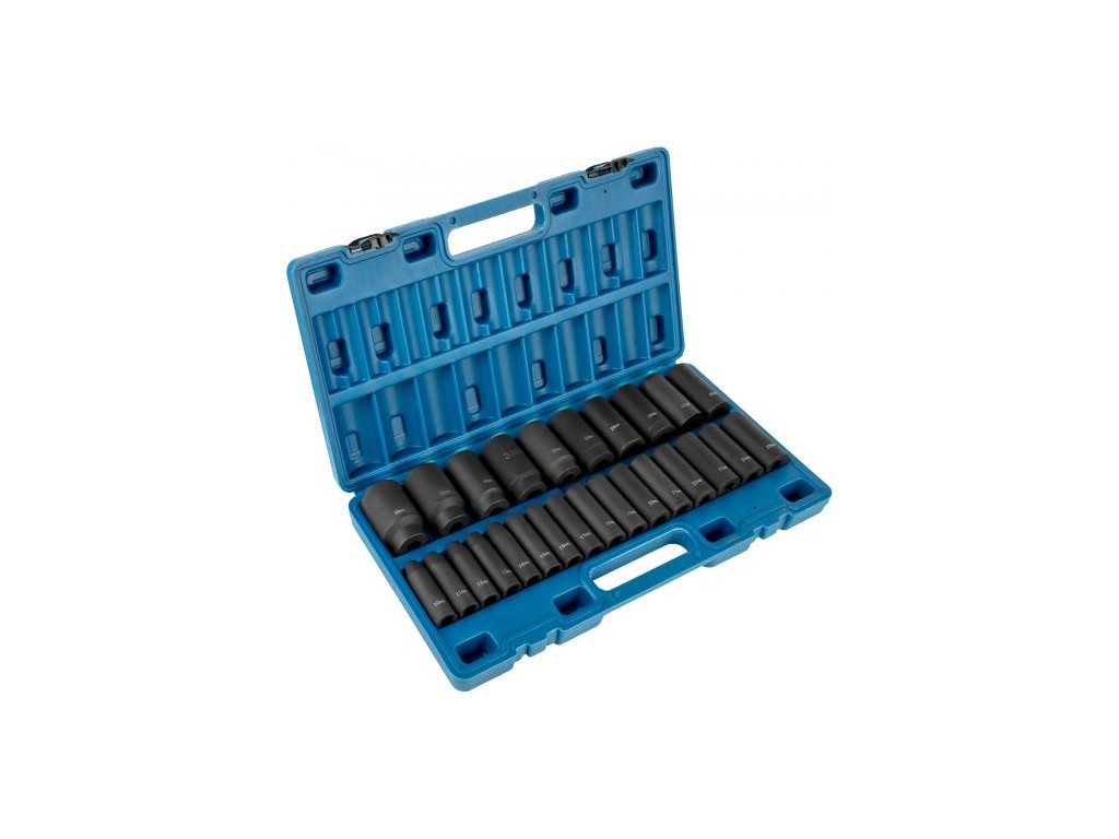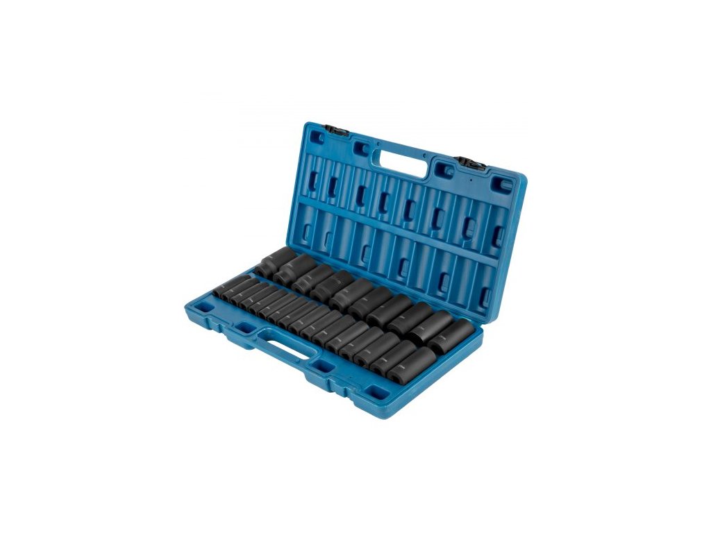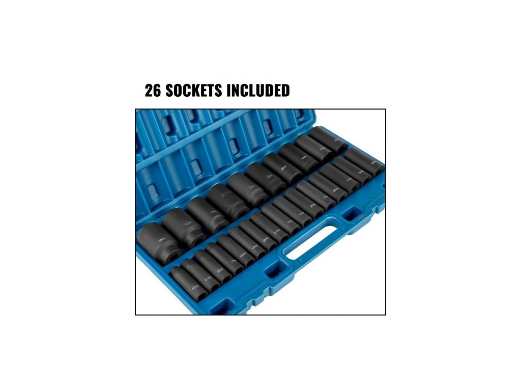 Sada rázových nástrčných klíčů: 26 kusů,Provedení: Hluboké, 6hranné,Materiál: CR-V,Velikost klíče: 1/2 palce