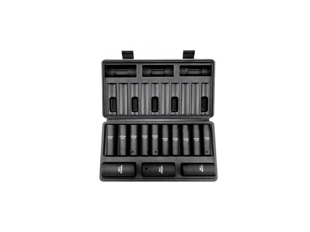 Sada rázových nástrčných klíčů: 13 kusů, hluboké nástrčné klíče: 10 mm, 11 mm, 12 mm, 13 mm, 14 mm, 15 mm, 16 mm, 17 mm, 18 mm, 19 mm, 21 mm, 22 mm, 24 mm, Číslo modelu položky: SS217813A, Materiál: legovaná ocel CR-V, Tvrdost: HRC42-48, Čistá hmotnost: 6,83 lb / 3,1 kg, Rozměry produktu: 11,93 x 6,02 x 2,28 palce / 303 x 153 x 58 mm