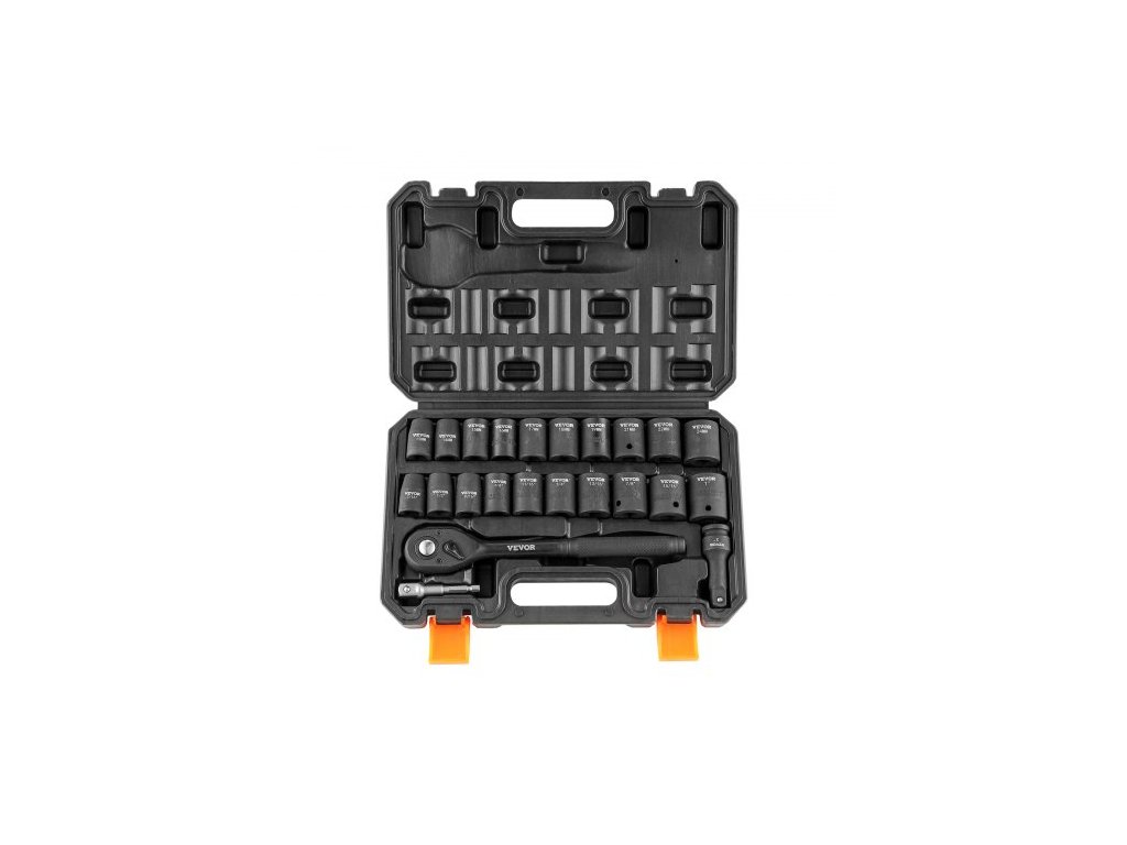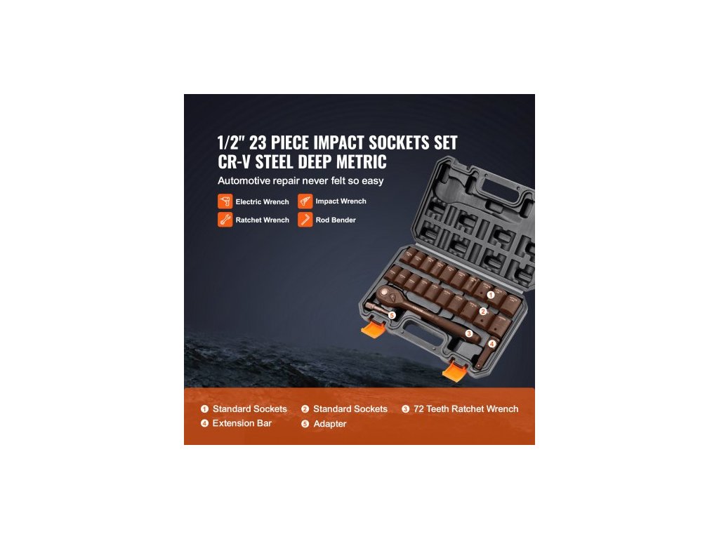 Sada rázových nástrčných klíčů 1/2", 23dílná sada nástrčných klíčů SAE (7/16" - 1") a metrické 6hranné, legovaná ocel Cr-V pro opravy automobilů s ráčnou, robustní úložný kufřík