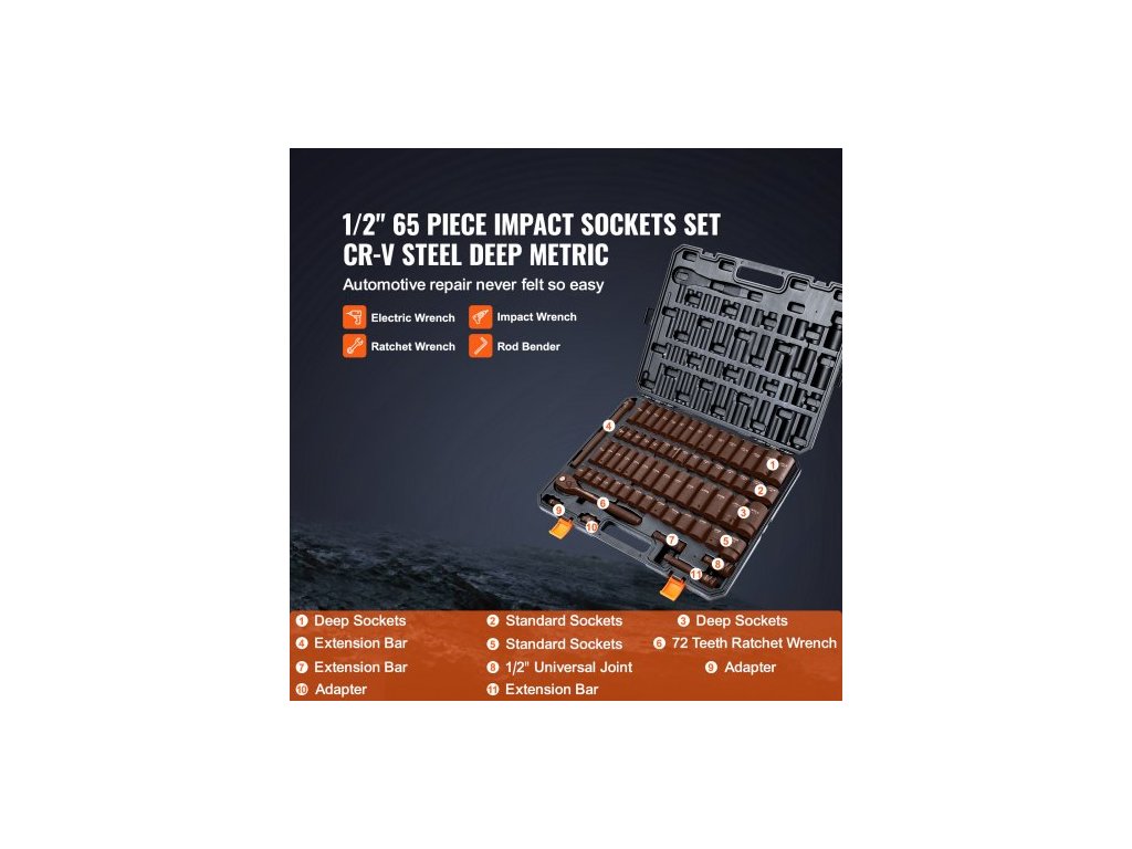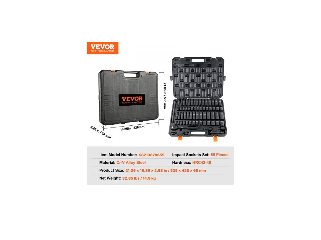 Sada rázových nástrčných klíčů: 65 kusů, Číslo modelu položky: SS213878655, Materiál: legovaná ocel Cr-V, Tvrdost: HRC42-48, Čistá hmotnost: 32,85 lbs / 14,9 kg, Rozměry výrobku: 21,06 x 16,85 x 2,68 palce / 535 x 428 x 68 mm