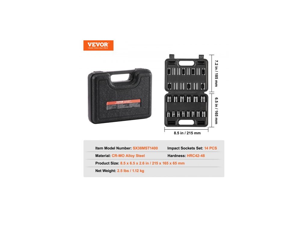 Číslo modelu položky: SX38MST1400,Množství: 14 ks,Materiál: legovaná ocel CR-MO,Tvrdost: HRC42-48,Rozměry úložného boxu: 8,5 x 6,5 x 2,6 palce / 215 x 165 x 65 mm,Čistá hmotnost: 2,5 lbs / 1,12 kg