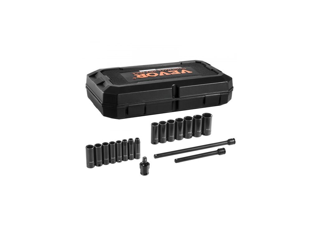 Sada rázových nástrčných klíčů 3/8", 18dílná sada hlubokých nástrčných klíčů, metrické 8-22 mm, 6hranná legovaná ocel CR-V pro opravy automobilů, snadno čitelné označení velikosti, robustní konstrukce, včetně úložného pouzdra.