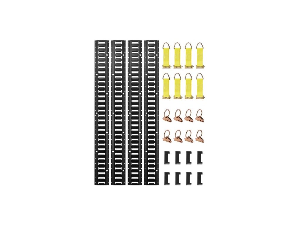 Sada upevňovacích lišt E Track, 30dílná sada E-Track o délce 152,4 cm, obsahuje 4 ocelové lišty, 2 jednodrážkové, 8 O-kroužků, 8 úchytů s D-kroužkem a 8 koncovými krytkami, příslušenství pro upevnění nákladu, motocyklů a kol