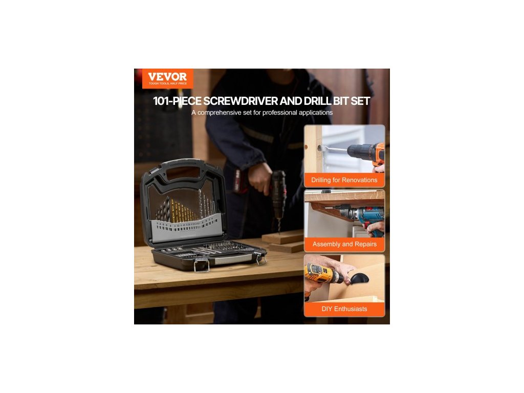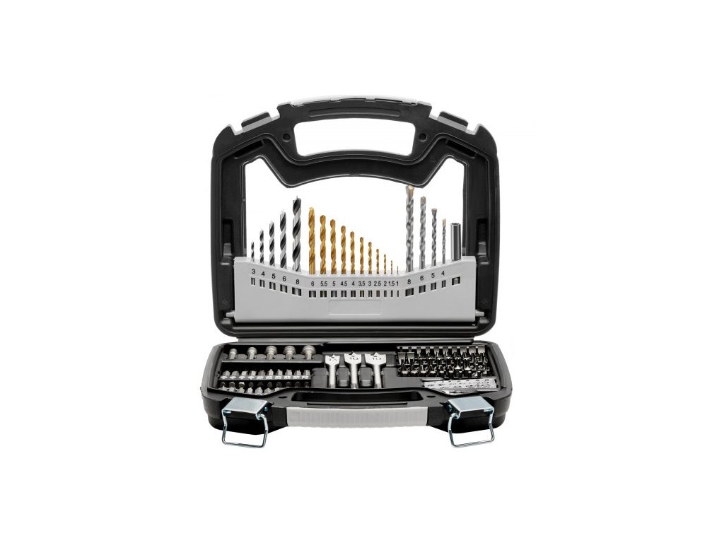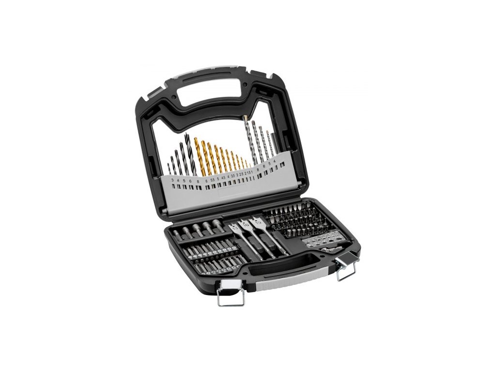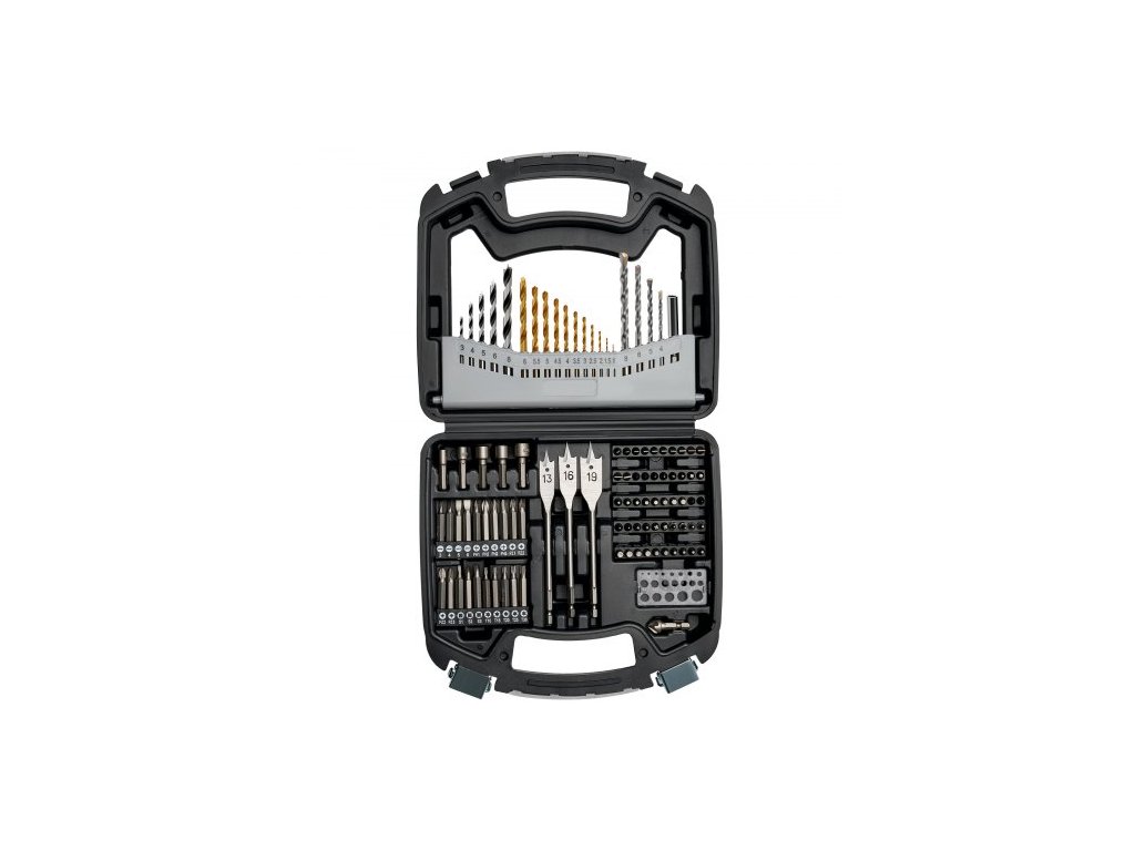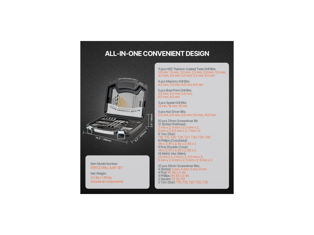 Číslo modelu položky: 101dílná sada vrtáků a bitů,Rozměry úložného pouzdra: 260 x 235 x 65 mm,Čistá hmotnost: 1,45 kg (včetně všech komponentů)
