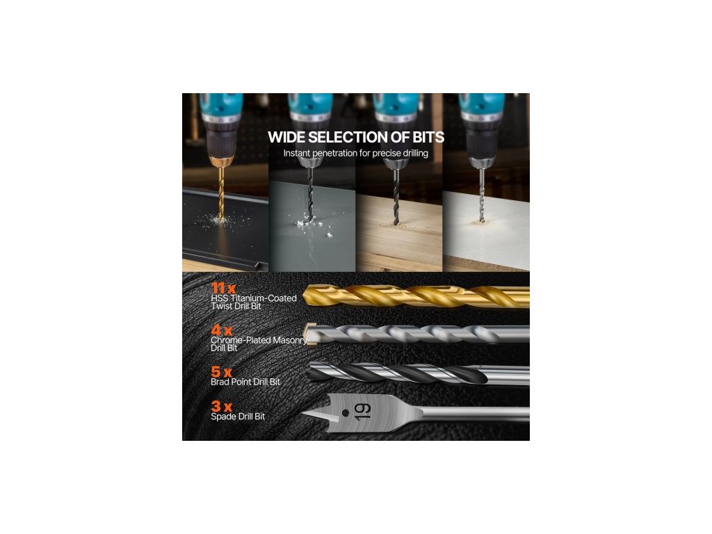 Sada vrtáků , 101dílná sada vrtáků a šroubováků, sada šroubováků vhodná pro vrtání a šroubování do dřeva, kovu, cementu, sady vrtáků v kombinované sadě v uspořádaném přepravním pouzdře