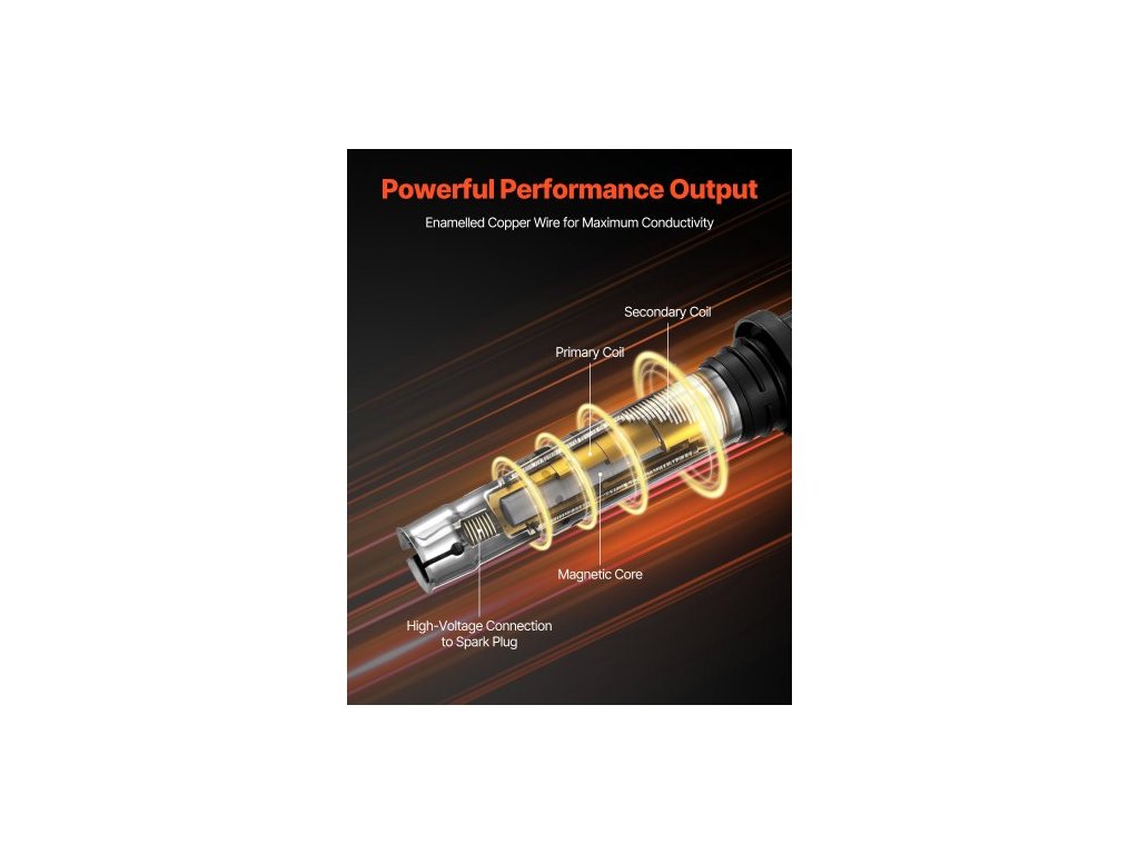 Minimální výstupní napětí (V): >=24000, Počet zapalovacích cívek (ks): 4, Materiály: Smaltovaný měděný drát, epoxidové pryskyřičné pouzdro, Číslo modelu položky: DQ9106L, Rozměry: 5,55" x 2,13" x 1,36" / 141 x 54 x 34,5 mm, Typ montáže: Zásuvný, Čistá hmotnost: 0,68 kg