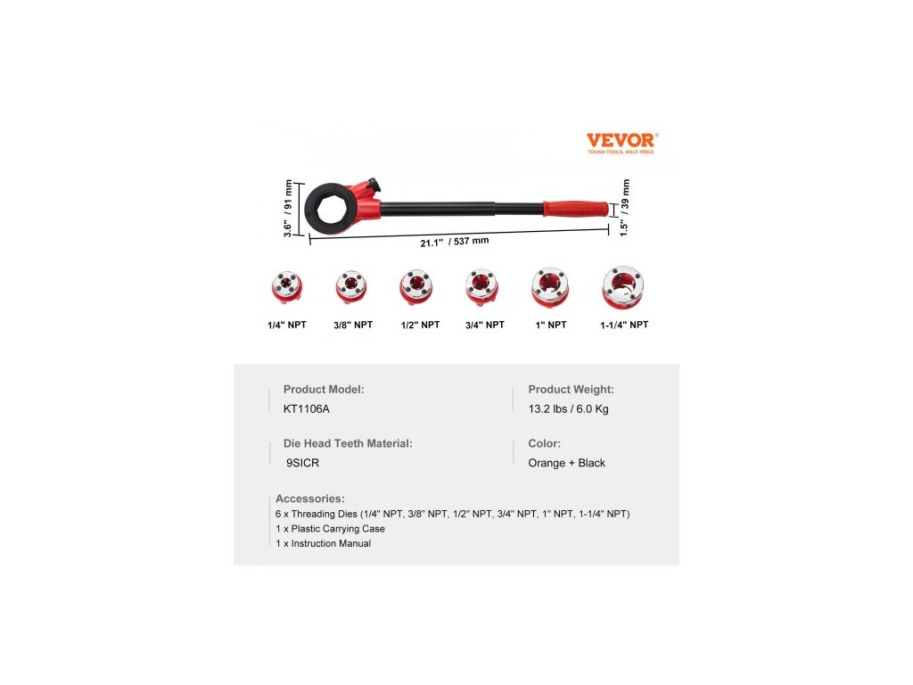 6 závitořezných čelistí: 1/4" NPT, 3/8" NPT, 1/2" NPT, 3/4" NPT, 1" NPT, 1-1/4" NPT, číslo modelu položky: KT1106A, materiál zubů závitořezné hlavy: 9SICR, barva: oranžová + černá, hmotnost výrobku: 13,2 lbs / 6,0 kg, rozměry výrobku: 21,1"x3,6"x1,5" / 537x91x39 mm