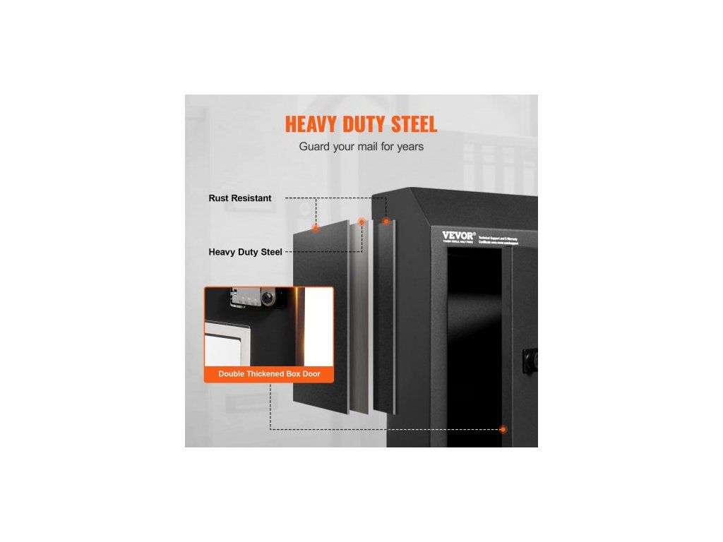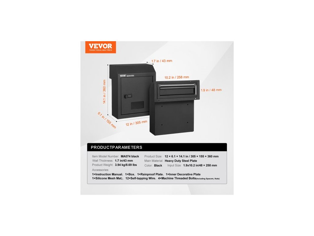 Rozměry vstupu: 1,9 × 10,2 palce/48 × 258 mm,Barva: Černá,Číslo modelu položky: MA074 černá,Hmotnost výrobku: 3,94 kg/8,69 lbs,Tloušťka stěny: 1,7 palce/43 mm,Hlavní materiál: Odolný ocelový plech,Rozměry výrobku: 12 × 6,1 × 14,1 palce/305 × 155 × 360 mm