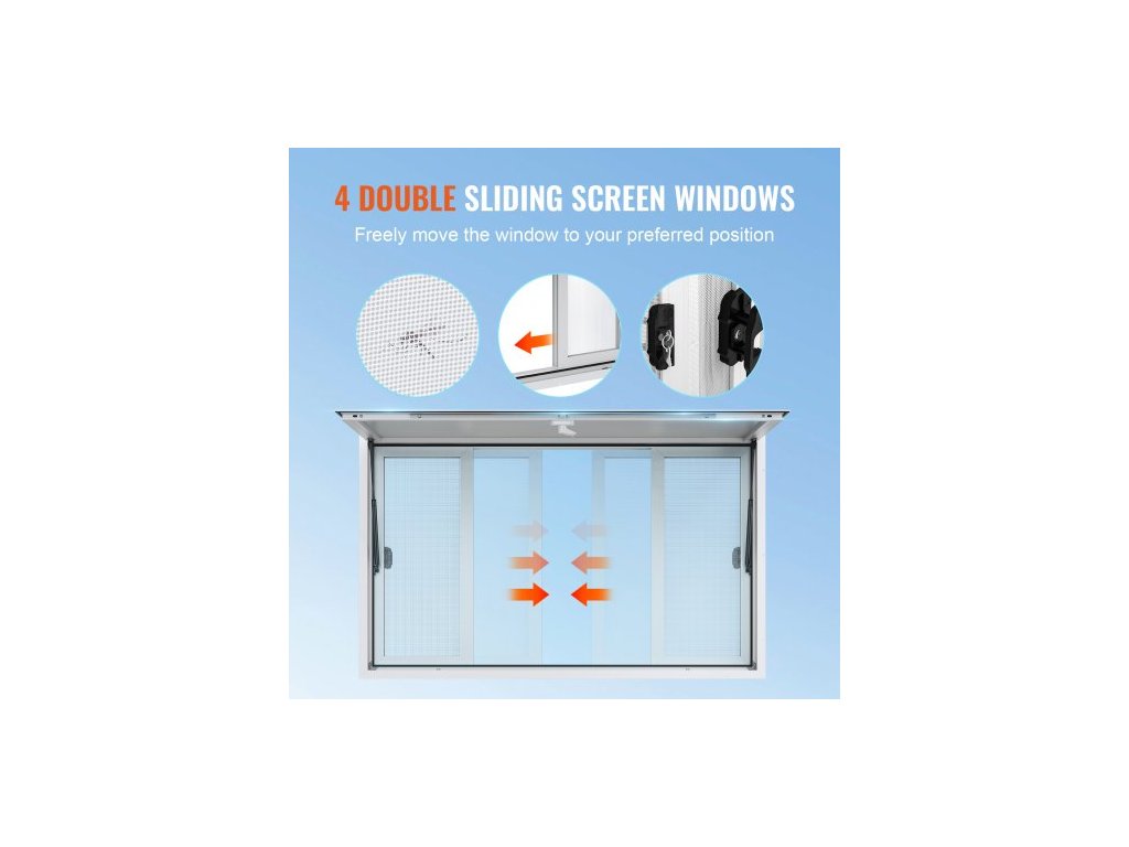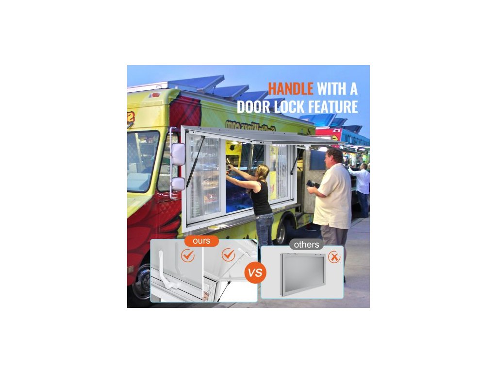 Servírovací okno 60"x36", hliníkové slitiny pro občerstvovací přívěsy se 4 horizontálními posuvnými okny, markýzou a tažným hákem, servírovací okno s úhlem až 85 stupňů pro občerstvovací přívěsy