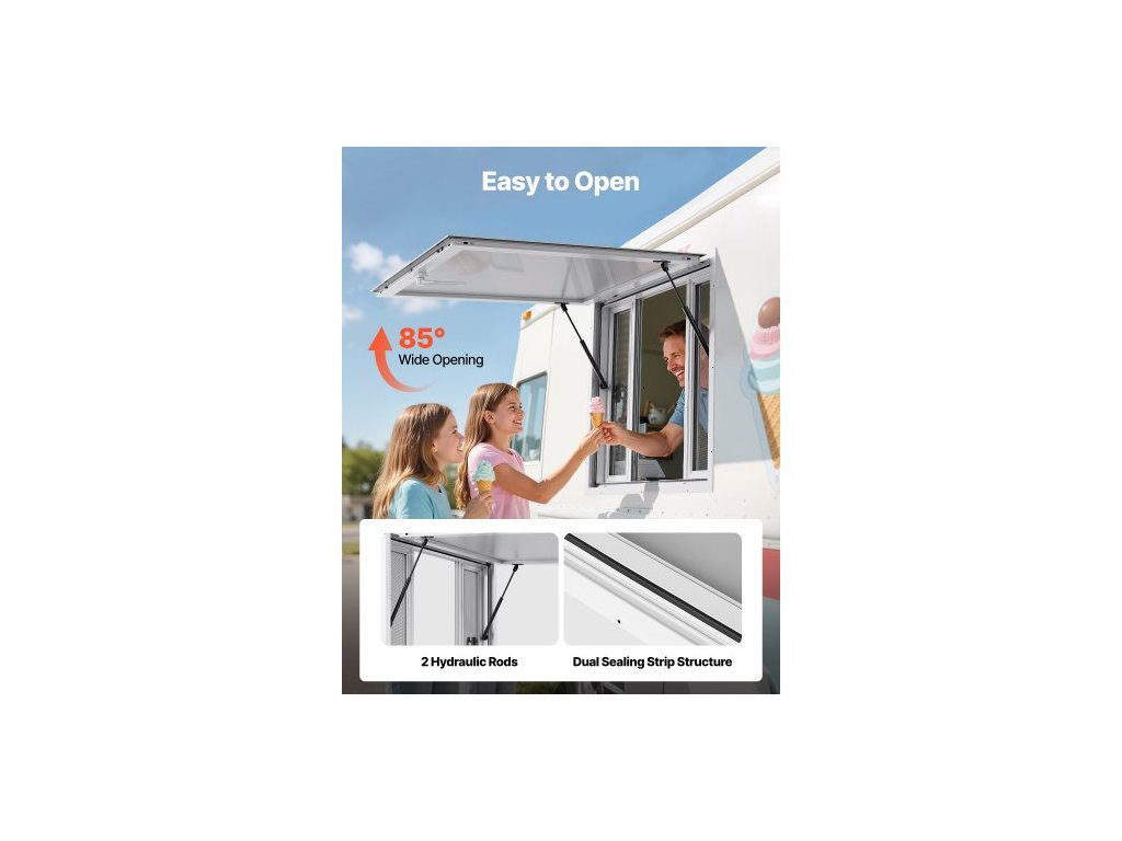 Servírovací okno 92x92 cm, hliníkové slitinové servisní okno pro food truck, servírovací okno s úhlem otevření až 85 stupňů se 4 posuvnými okny, markýzou a tažným hákem, pro koncesní přívěsy