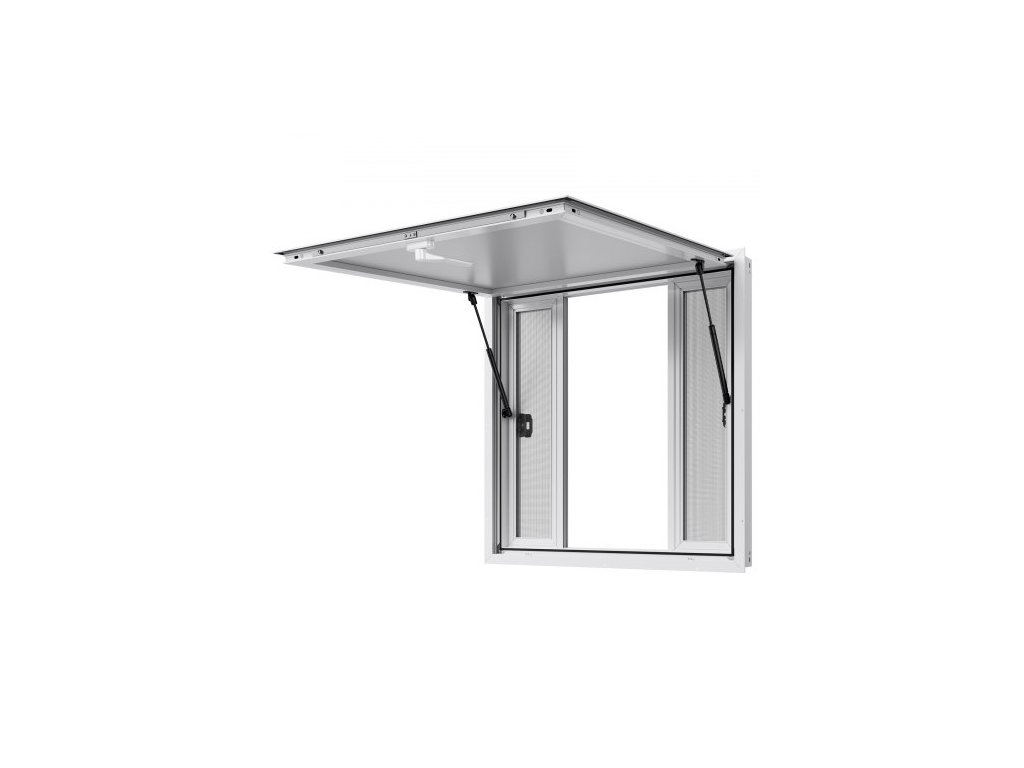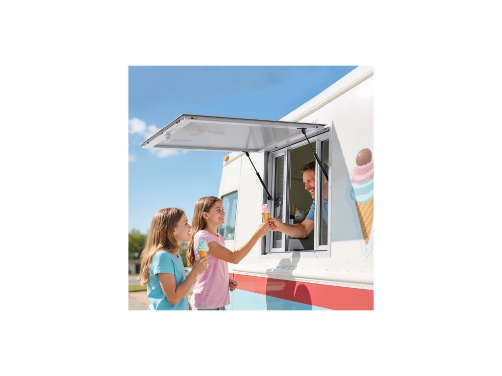 Okénko pro občerstvení 92x92 cm, Servírovací okénko z hliníkové slitiny pro pojízdné občerstvení, Servírovací okénko s úhlem výklopu až 85 stupňů se 4 posuvnými okny, markýzou a tažným hákem, pro občerstvovací přívěsy