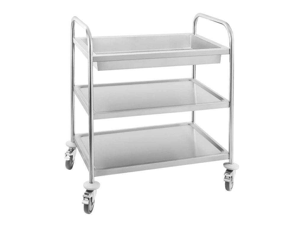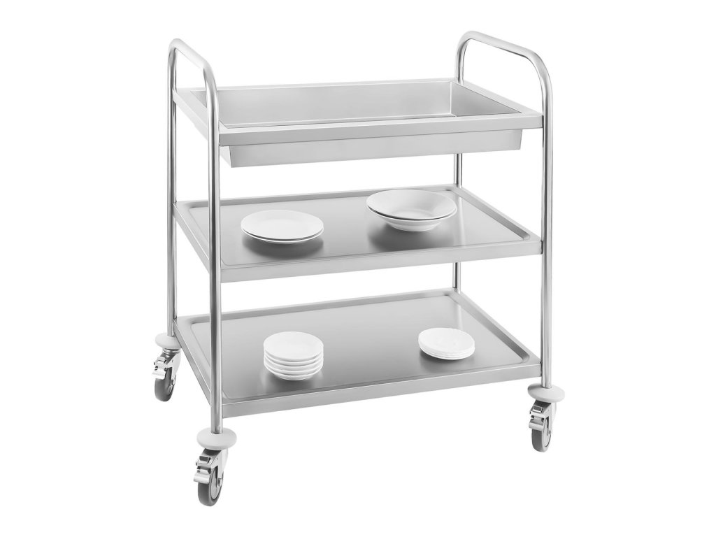 Servírovací vozík RCGW 1 přesvědčí svou stabilitou a spolehlivostí v profesionálních gastronomických podnicích, veřejných zařízeních a také doma. Díky vaně a dvěma odložným plochám je vozík z hodnotné ušlechtilé oceli všestranný pomocník. Díky mimořádně vysokému okraji horní vany se zabrání tomu, že nápoje a zbytky jídla vytečnou, či se převrátí. Nádobí se na sebe může bezpečně naskládat a je zaručeno jeho rychlé odklizení, což usnadní rychlou obsluhu hostů. Pod vanou se nachází 2 prostorné police na hrnce, pokrmy či ubrousky. Díky odstupu 27,5 cm mezi stabilními tablety, přičemž každý z nich může být zatížen do 50 kg, zde najdou své místo i větší kuchyňské potřeby. Kromě toho přesvědčí police svým speciálním nárazuvzdorným designem. Tím je kývání a hluk vozíku absorbováno speciálně připevněnou nárazuvzdornou izolací, čímž je zaručen tichý provoz. Nezáleží na tom, zda jde o keramické dlaždice, dřevěné desky či parkety. Sevírovací vozík snese všechny otřesy a je šetrný k Vašemu sluchu. Další komfort vzniká díky 4 lehkým kolečkům, které umožňují mobilní použití. Kolečka o průměru 10 cm mají samostatné parkovací brzdy, které zajišťují pevnost a stabilitu. Díky jejich celogumovému povlaku je možná neustálá transportace plně zatíženého vozíku bez hluku. Kromě toho jsou kolečka otočná o 360 °, což zajišťuje obratnost vozíku. Profil kulaté roury vozíku na nádobí usnadňuje montáž polic a kromě toho nabízí i atraktivní vzhled. Tento vozík na nádobí je robustní, přenosný, tichý, snadno se čistí a tím odpovídá všestranným požadavkům profesionálních gastrnomických podniků všem velikostí.