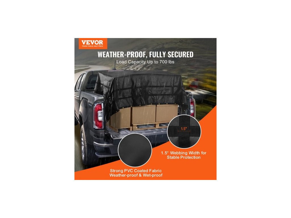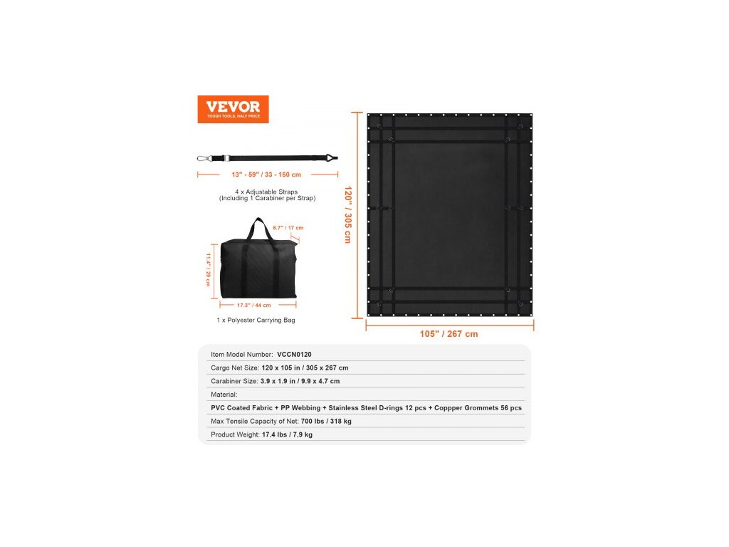 Nastavitelná velikost popruhu: 13 - 59 palců / 330 - 1500 mm,Vodotěsnost: Ano,Velikost karabiny: 3,9 x 1,9 palce / 99 x 47 mm,Maximální tažná kapacita sítě: 700 lbs / 318 kg,Číslo modelu položky: VCCN0120,Hmotnost výrobku: 17,4 lbs / 7,9 kg,Materiál: Tkanina potažená PVC + PP Popruhy + D-kroužky z nerezové oceli 12 ks + měděné průchodky 56 ks, Rozměry nákladu: 120 x 105 palců / 3050 x 2670 mm, Rozměry výrobku: 121,9 x 106 x 0,3 palce / 3095 x 2690 x 8 mm (plně rozložené)