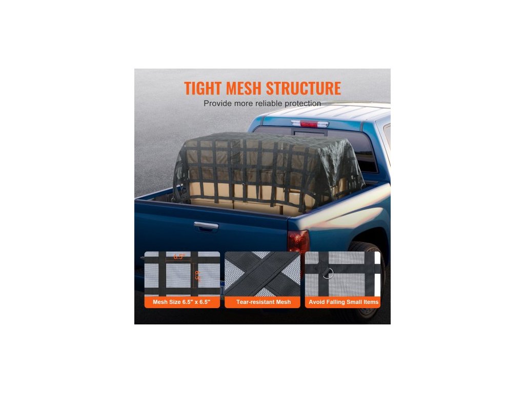 Síť Cargo Net, 120 x 105 palců, těžká síť pro nákladní automobily na korbu, 4 nastavitelné popruhy s karabinami a S-háky, odolná proti opotřebení a povětrnostním vlivům, vhodná pro pickup, nákladní automobil, džíp, SUV, loď