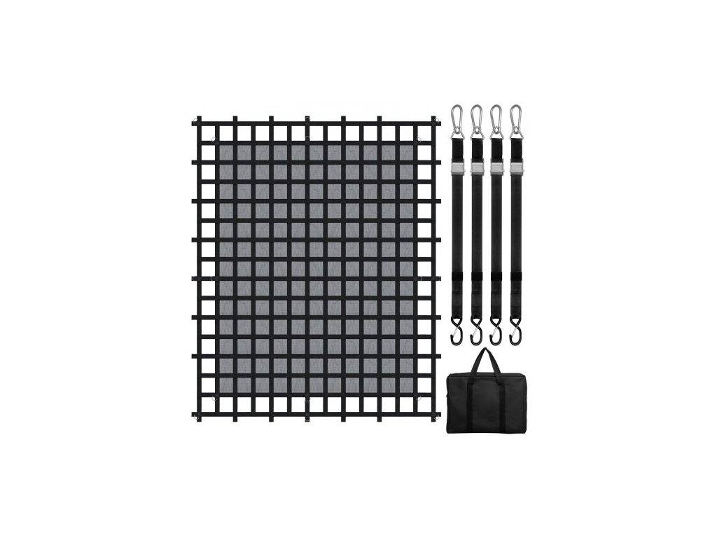 Průměr vnitřního kroužku S-háku: 0,1 palce / 30 mm,Rozměr S-háku: 4,1 x 1,6 palce / 105 x 40 mm,Nastavitelná velikost popruhu: 13 - 59 palců / 330 - 1500 mm,Rozměr karabiny: 3,9 x 1,9 palce / 99 x 47 mm,Maximální tažná kapacita sítě: 1500 lbs / 680 kg, Velikost otvoru: 6,5 x 6,5 palce / 165 x 165 mm, Číslo modelu položky: PLCN120, Hmotnost výrobku: 20,5 lbs / 9,3 kg, Materiál: Polyesterový popruh + D-kroužky z nerezové oceli 16 ks, Čistá velikost nákladu: 120 x 105 palců / 3020 x 2670 mm, Rozměry výrobku: 121,7 x 106,3 x 0,4 palce / 3090 x 2700 x 10 mm (plně rozložený)