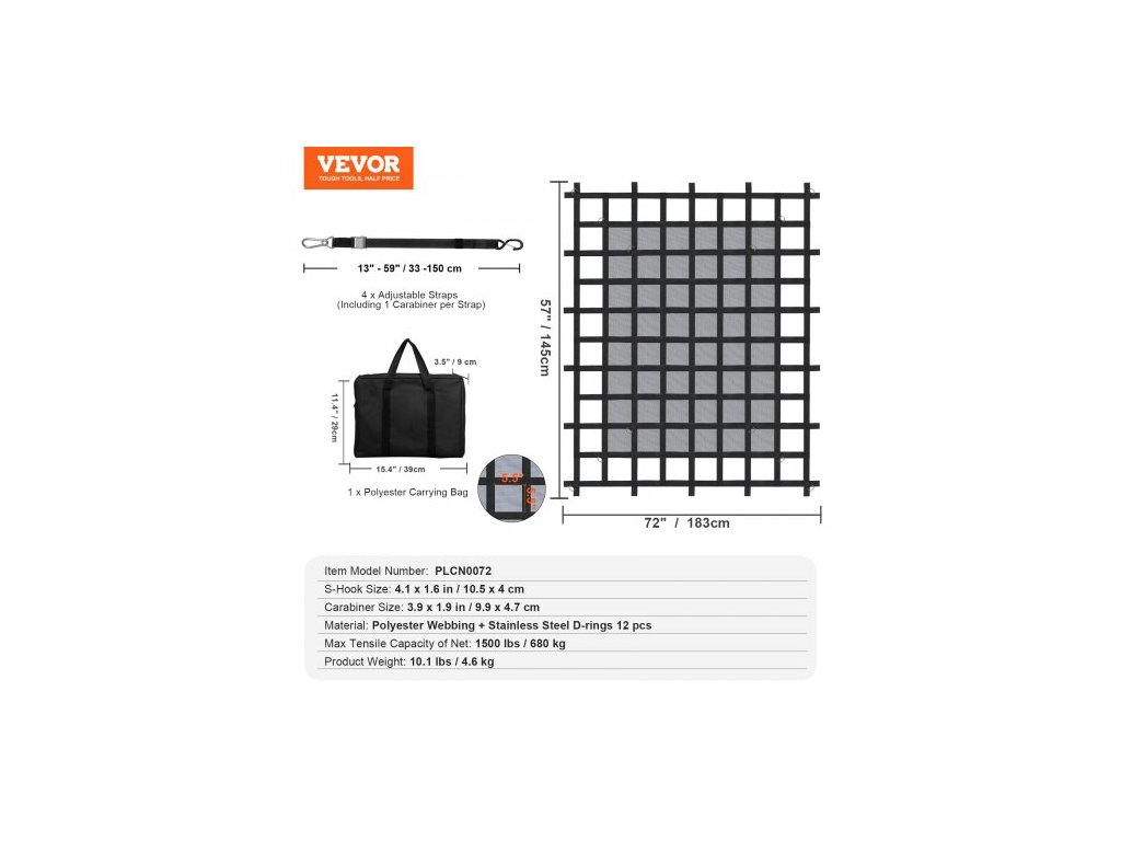 Vnitřní průměr kroužku S-háku: 0,1" / 30 mm,Rozměr S-háku: 4,1" x 1,6" / 105" x 40 mm,Nastavitelná velikost popruhu: 13-59" / 330-1500 mm,Rozměr karabiny: 3,9" x 1,9" / 99" x 47 mm,Maximální tažná nosnost sítě: 1500 lbs / 680 kg,Otvor Rozměry: 5,5 x 5,5 palce / 140 x 140 mm, Číslo modelu položky: PLCN0072, Hmotnost výrobku: 10,1 lbs / 4,6 kg, Materiál: Polyesterový popruh + D-kroužky z nerezové oceli 12 ks, Rozměry čistého nákladu: 72 x 57 palce / 1830 x 1450 mm, Rozměry výrobku: 76 x 61 x 0,5 palce / 1930 x 1550 x 12 mm (plně rozložený)