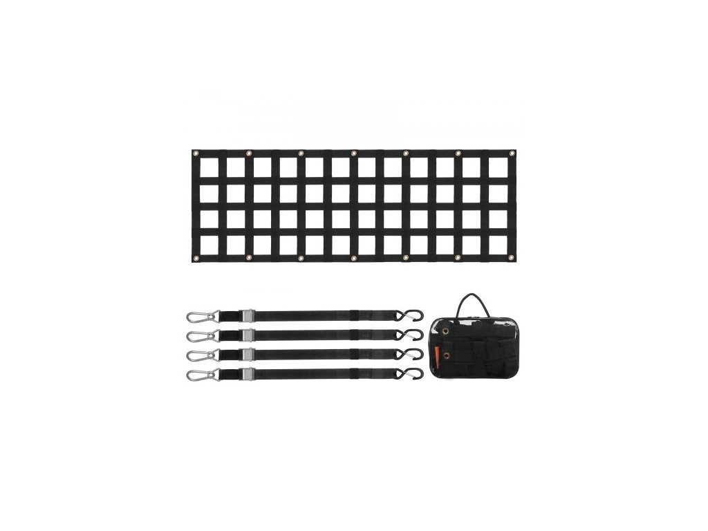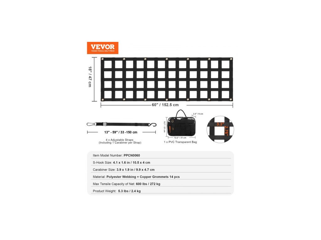 Rozměry S-háku: 4,1 x 1,6 palce / 105 x 40 mm,Nastavitelná velikost popruhu: 13 - 59 palců / 330 - 1500 mm,Rozměry karabiny: 3,9 x 1,9 palce / 99 x 47 mm,Maximální tažná kapacita sítě: 600 liber / 272 kg,Rozměry sítě na zadní dveře: 60 x 18 palců / 1525 x 470 mm,Otvor Rozměry: 85 x 70 mm, Číslo modelu položky: PPCN0060, Hmotnost výrobku: 2,4 kg, Materiál: PP popruhy + měděné průchodky 14 ks, Rozměry výrobku: 1510 x 470 x 7,5 mm (plně rozložené)