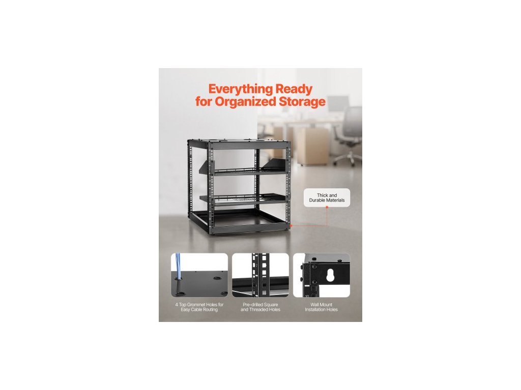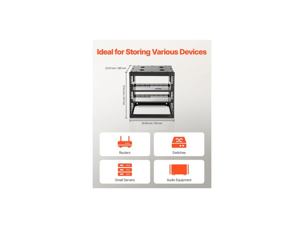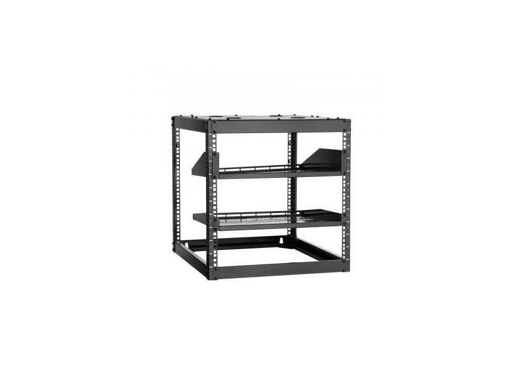 Síťový rack 10U s otevřeným rámem, hloubka 585 mm, nástěnný nebo stojící serverový rack, odolný 4sloupkový, s odvětrávanými policemi a montážním materiálem, pojme veškeré vaše síťové IT vybavení, AV zařízení.