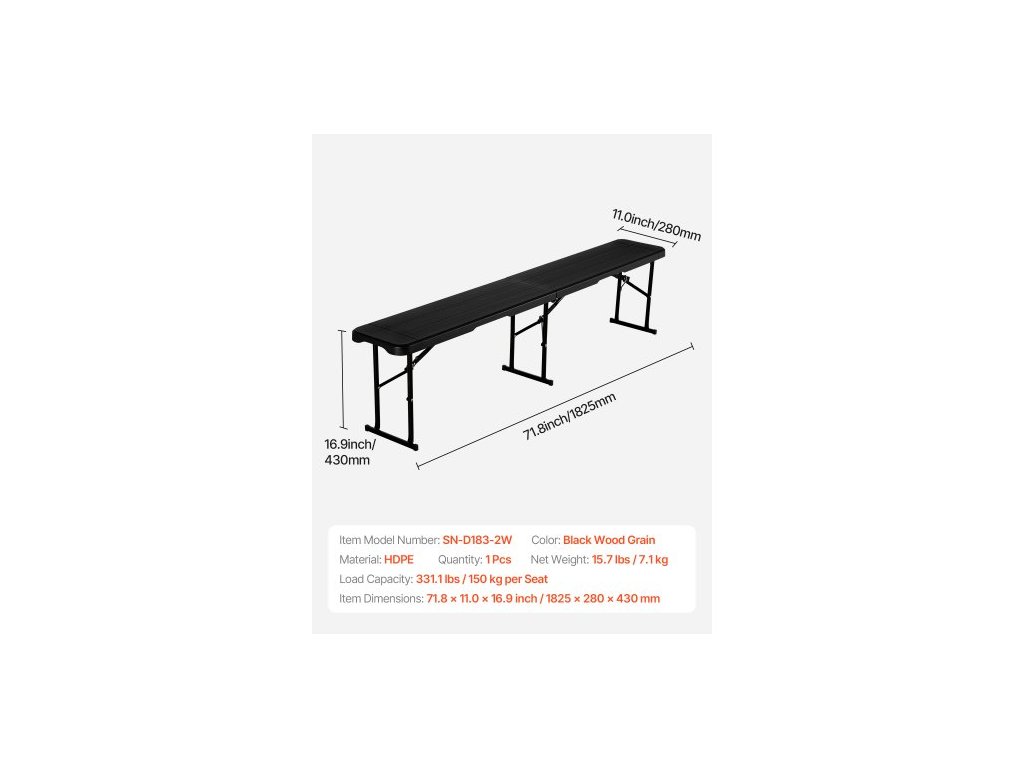 Nosnost: 220,5 lbs / 100 kg na sedadlo,Barva: Černá,Číslo modelu položky: SN-D183-2W,Množství: 1,Materiál: HDPE,Rozměry položky: 71,8 x 11,0 x 16,9 palce / 1825 x 280 x 430 mm,Čistá hmotnost: 15,7 lbs / 7,1 kg
