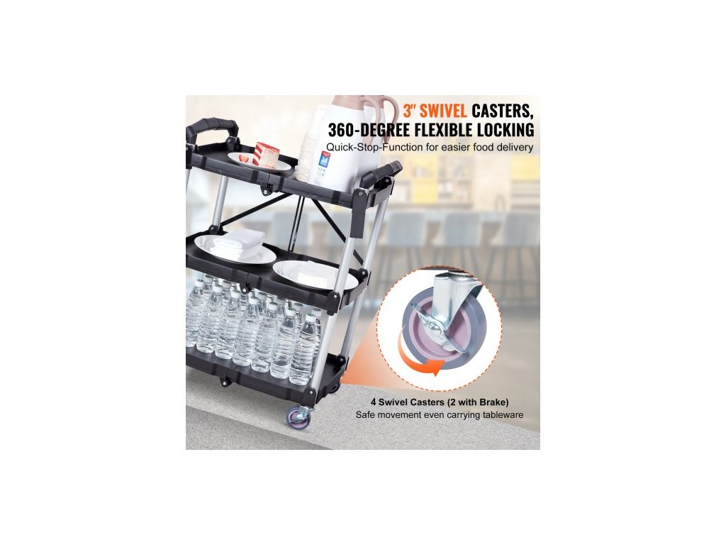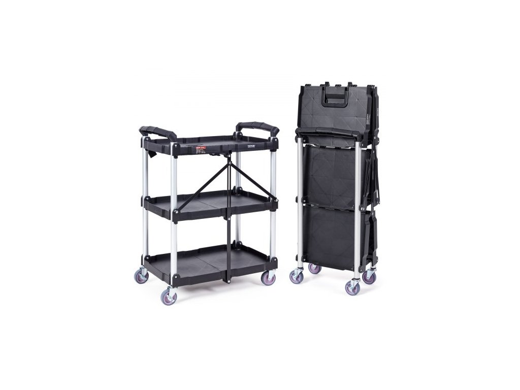 Skládací servisní vozík , 3 police, 74,8 kg, robustní plastový vozík na kolečkách s aretovatelnými kolečky, ergonomická rukojeť, přenosný garážový vozík na nářadí pro sklad/kancelář/domácnost (65,1 x 39,2 x 83,2 cm)