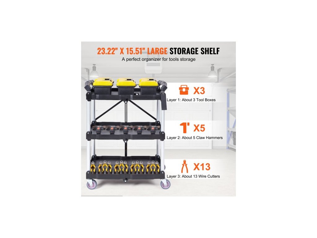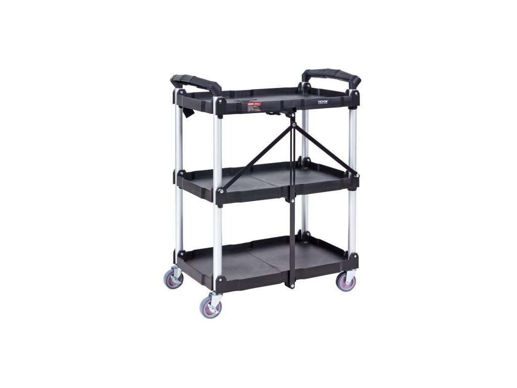 Skládací servisní vozík , 3 police, 74,8 kg, těžký plastový pojízdný vozík s uzamykatelnými kolečky, ergonomická rukojeť, přenosný garážový vozík na nářadí do skladu/kanceláře/domácnosti (65,1 x 39,2 x 83,2 cm)