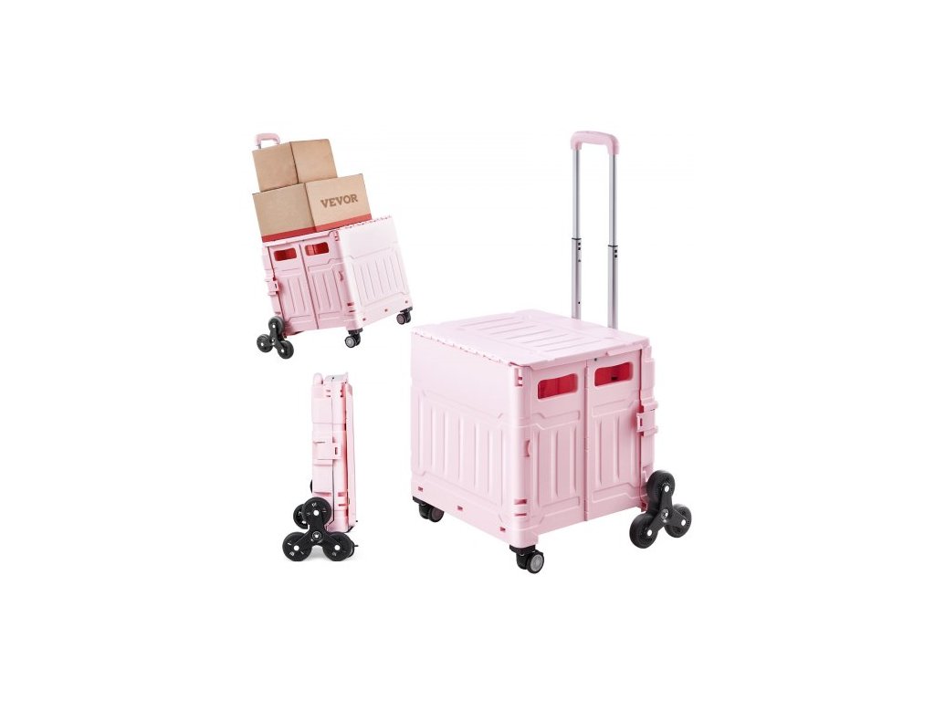 Skládací úžitkový vozík , 65l skládací přenosný vozík na přepravky s kolečky pro šlapání po schodech a otočnými koly o 360°, ruční vozík s teleskopickou rukojetí pro nákupní kancelář, stěhování učitele, růžový