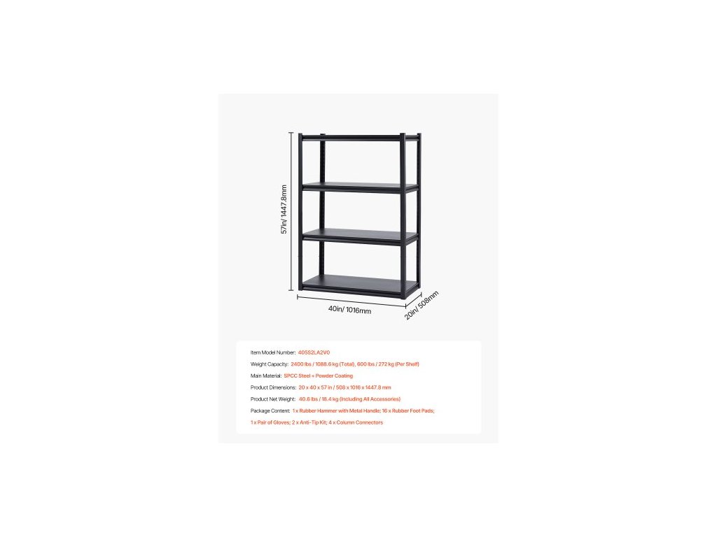 Nosnost: 2400 lbs / 1088,6 kg (celkem), 600 lbs / 272 kg (na polici), Číslo modelu položky: 405S2LA2V0, Čistá hmotnost výrobku: 40,6 lbs / 18,4 kg (včetně veškerého příslušenství), Rozměry výrobku: 20 x 40 x 57 palců / 508 x 1016 x 1447,8 mm, Hlavní materiál: SPCC ocel + Práškové lakování