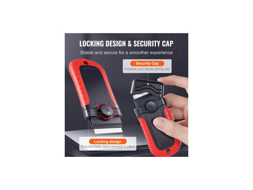 Škrabka s žiletkou, 15 náhradních čepelí, uzamykatelný škrabák s bezpečnostním uzávěrem, čepele z uhlíkové oceli a POM, pro čištění štítků, samolepek, obtisků a barvy ze skla, oken, sporáků a troub
