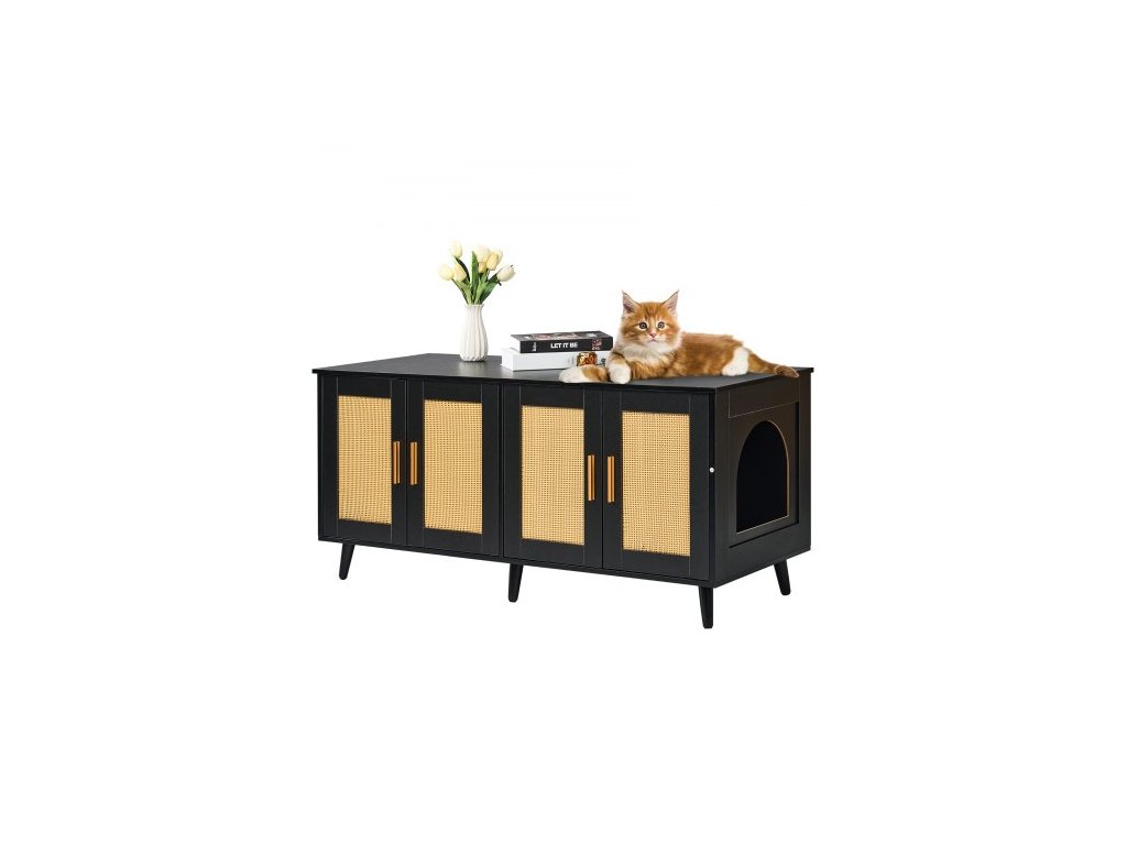 skříňka na kočičí toaletu pro 2 kočky, skrytý nábytek do toalety s ratanovými dvířky, dřevěná skříňka na kočičí toaletu se hodí do většiny kočičích toalet, 122,4 cm D x 49,7 cm Š x 54,3 cm V, černá