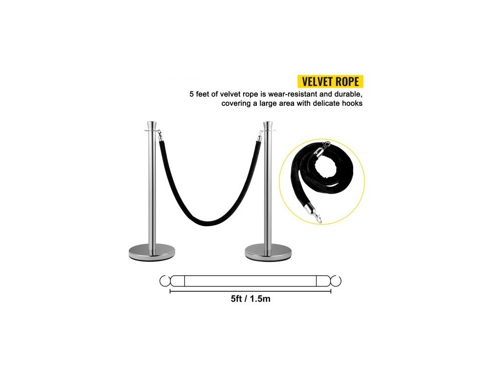 Sloupek pro regulaci davu, sada 2 kusů sloupků, sada sloupků s 1,5m černým sametovým lanem, stříbrná zábrana pro regulaci davu s pevnou betonovou a kovovou základnou - snadná montáž