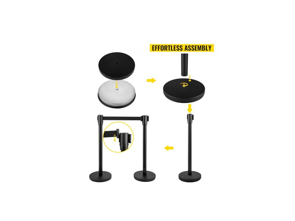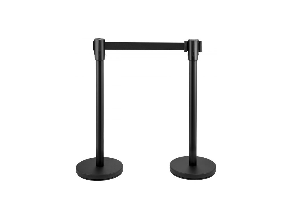 Sloupek pro regulaci davu, sada 8 dílů, sada sloupků s 2m černým navíjecím pásem, černá zábrana pro regulaci davu s betonovou a kovovou základnou – snadná montáž