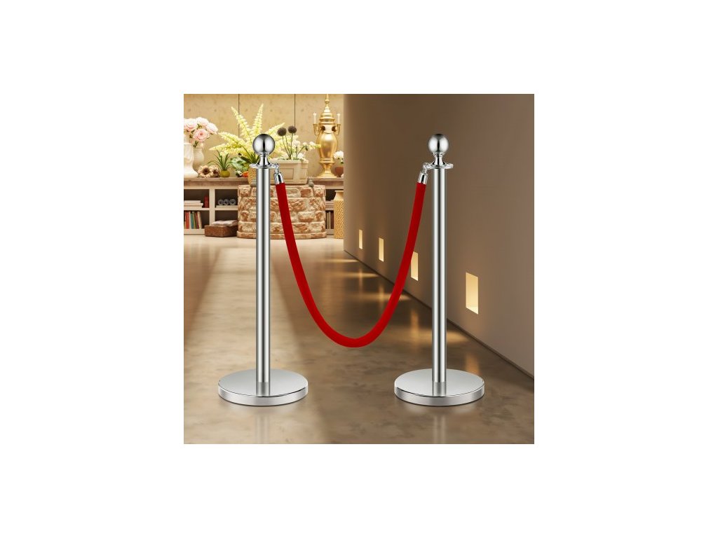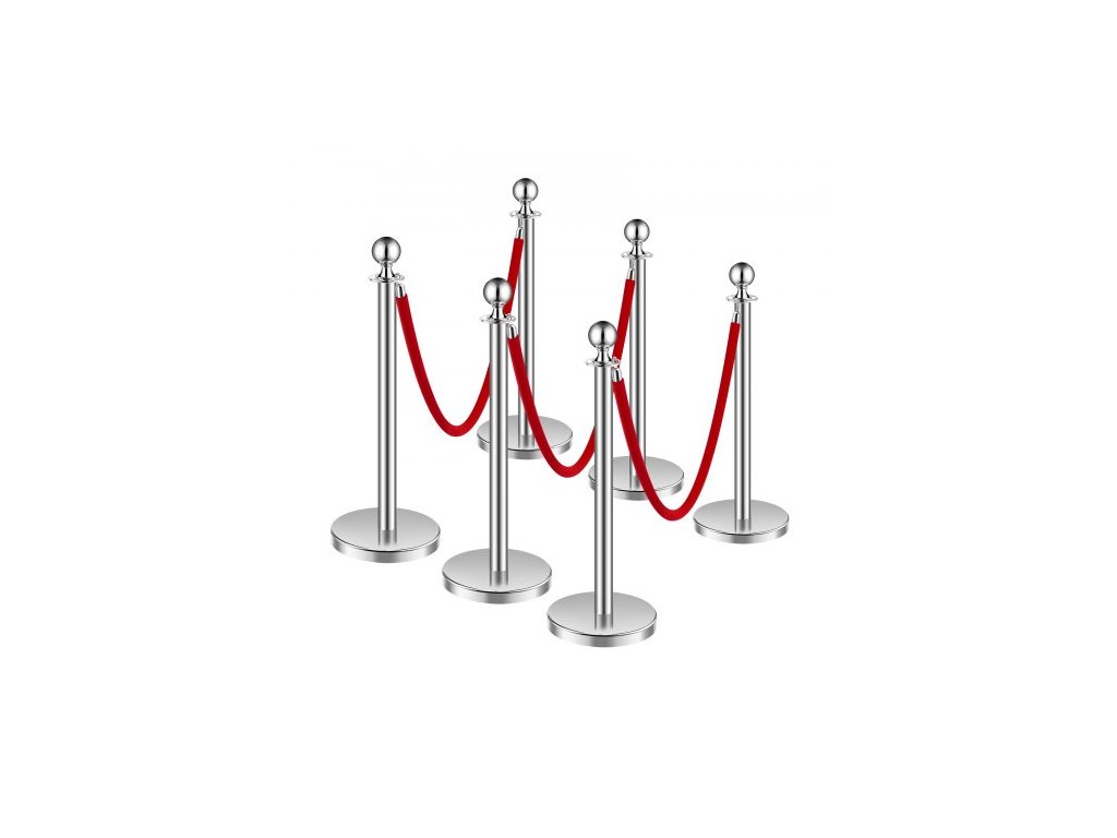 Sloupky, sada 6 kusů pro regulaci davu se 3 červenými sametovými lany, fronta ze stříbrných sloupků z nerezové oceli o délce 5 stop s dutou základnou pro vstřikování písku pro divadlo, večírek, svatbu, výstavu